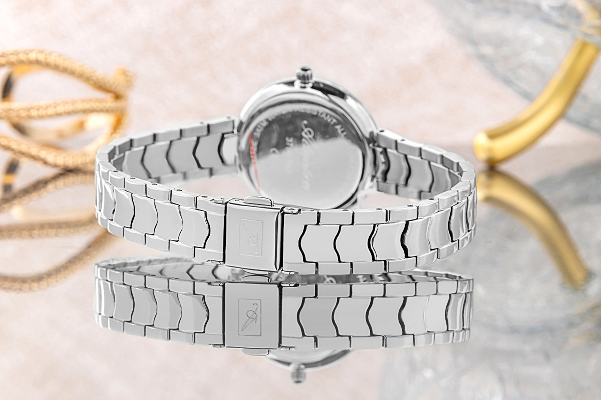 Zbliżenie na tarczę tego zegarka to prawdziwa uczta dla oka. Hipnotyzujący, giloszowany wzór w centrum układa się w geometryczne promienie, które przy każdym ruchu nadgarstka łapią światło, tworząc falujący efekt. Srebrne wskazówki zostały zaprojektowane z kobiecą lekkością – płynnie przesuwające się po tarczy z zegarmistrzowską precyzją. Indeksy godzinowe przybierają postać minimalistycznych, wypukłych znaczników, idealnie wkomponowanych w strukturę tarczy. Całość dopełniają: nazwa Adriatica na tarczy, i dyskretne logo na zapięciu bransolety oraz na koronce zegarka.
