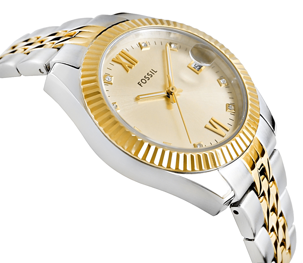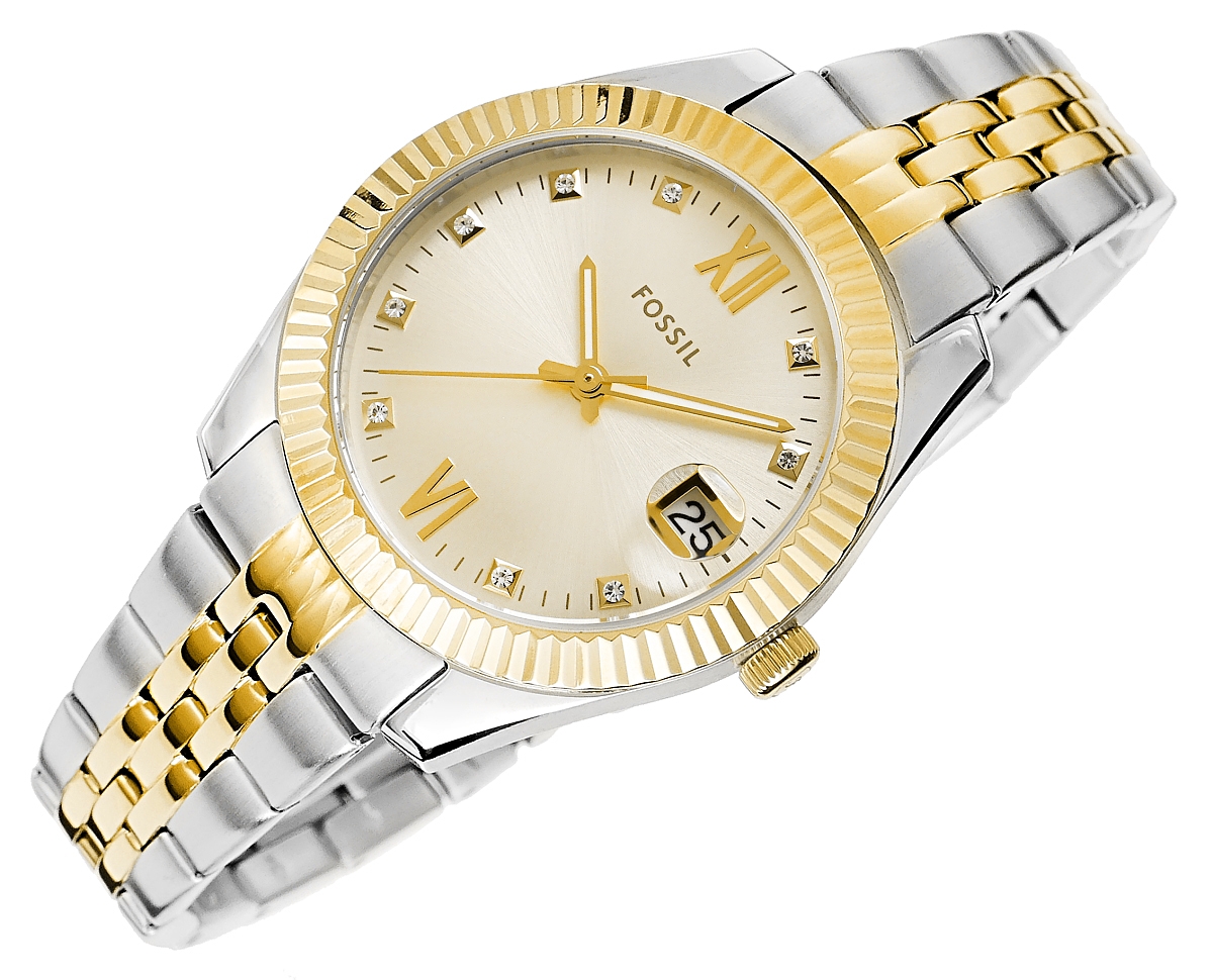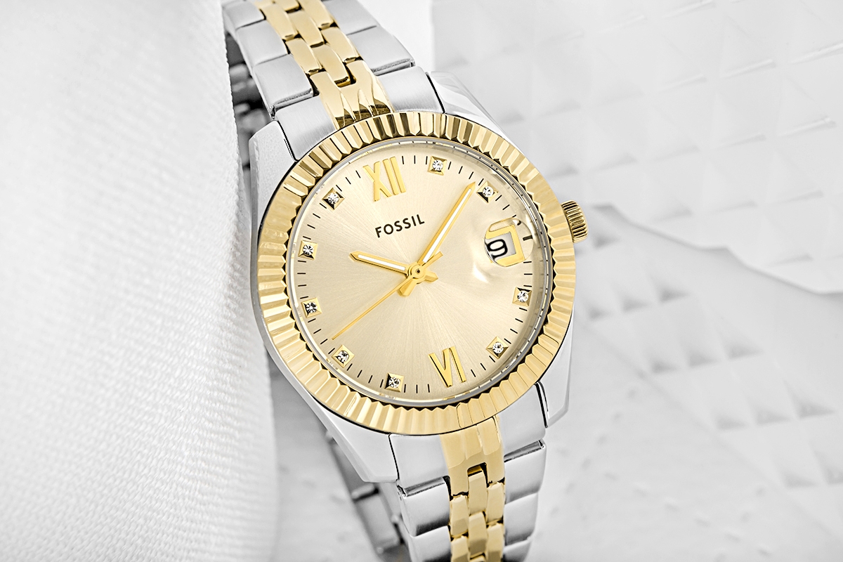 Zegarek Fossil Scarlette to nie tylko czasomierz – to biżuteria, która pulsuje rytmem Twojego dnia. Srebrno-złota bransoleta oplata nadgarstek niczym luksusowa tkanina, łącząc klasyczną elegancję z nutą nowoczesnego stylu. Złota tarcza w wykończeniu sunray delikatnie igra ze światłem, niczym promienie słońca odbijające się od tafli wody. Każdy ruch nadgarstka wydobywa jej subtelny blask, a żłobiona luneta dodaje głębi i charakteru. Kryształowe akcenty na indeksach rozświetlają tarczę, przywodząc na myśl migotliwe refleksy drogocennej biżuterii. Datownik, dyskretnie wkomponowany w design, sprawia, że ten zegarek jest nie tylko piękny, ale też praktyczny.