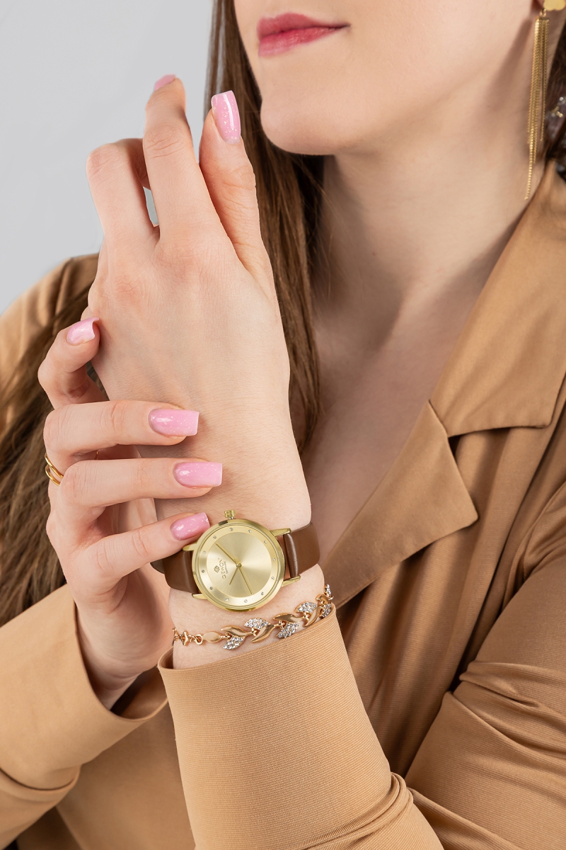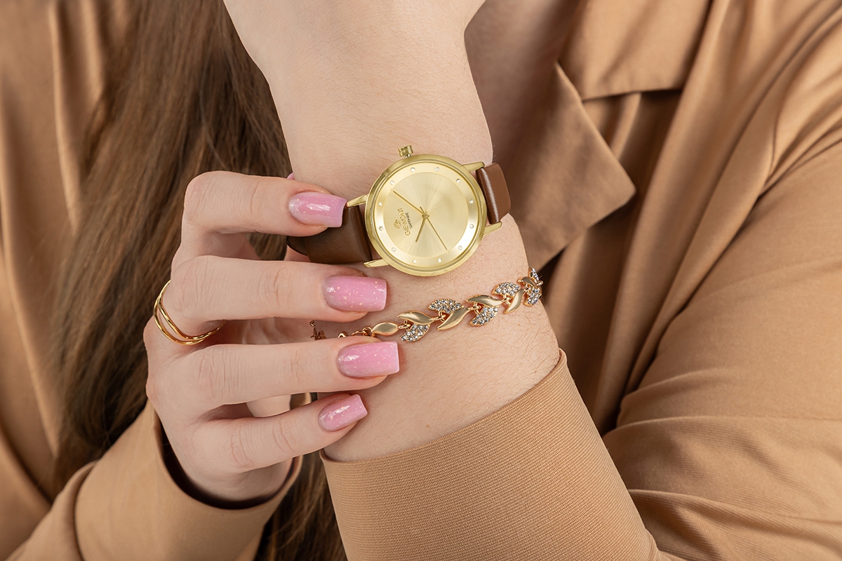 Starannie wykonany pasek ze skóry naturalnej stanowi eleganckie dopełnienie damskiego zegarka, podkreślając jego subtelny i kobiecy charakter. Miękka, przyjemna w dotyku skóra delikatnie układa się na nadgarstku, zapewniając wysoki komfort noszenia przez cały dzień. To element, który harmonijnie współgra z całością, dodając zegarkowi klasy i wyrafinowania.