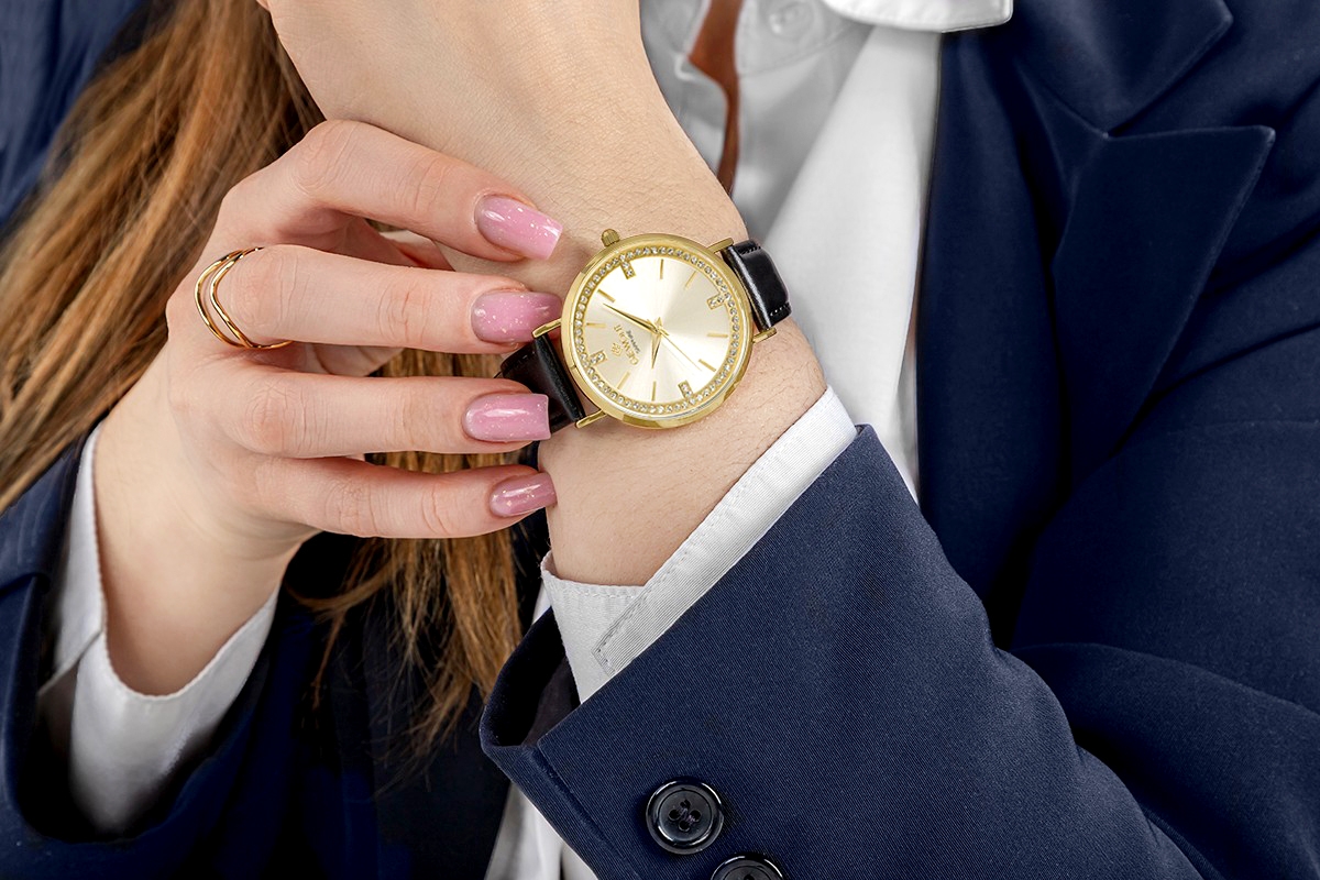 Starannie wykonany pasek ze skóry naturalnej stanowi eleganckie dopełnienie damskiego zegarka, podkreślając jego subtelny i kobiecy charakter. Miękka, przyjemna w dotyku skóra delikatnie układa się na nadgarstku, zapewniając wysoki komfort noszenia przez cały dzień. To element, który harmonijnie współgra z całością, dodając zegarkowi klasy i wyrafinowania.