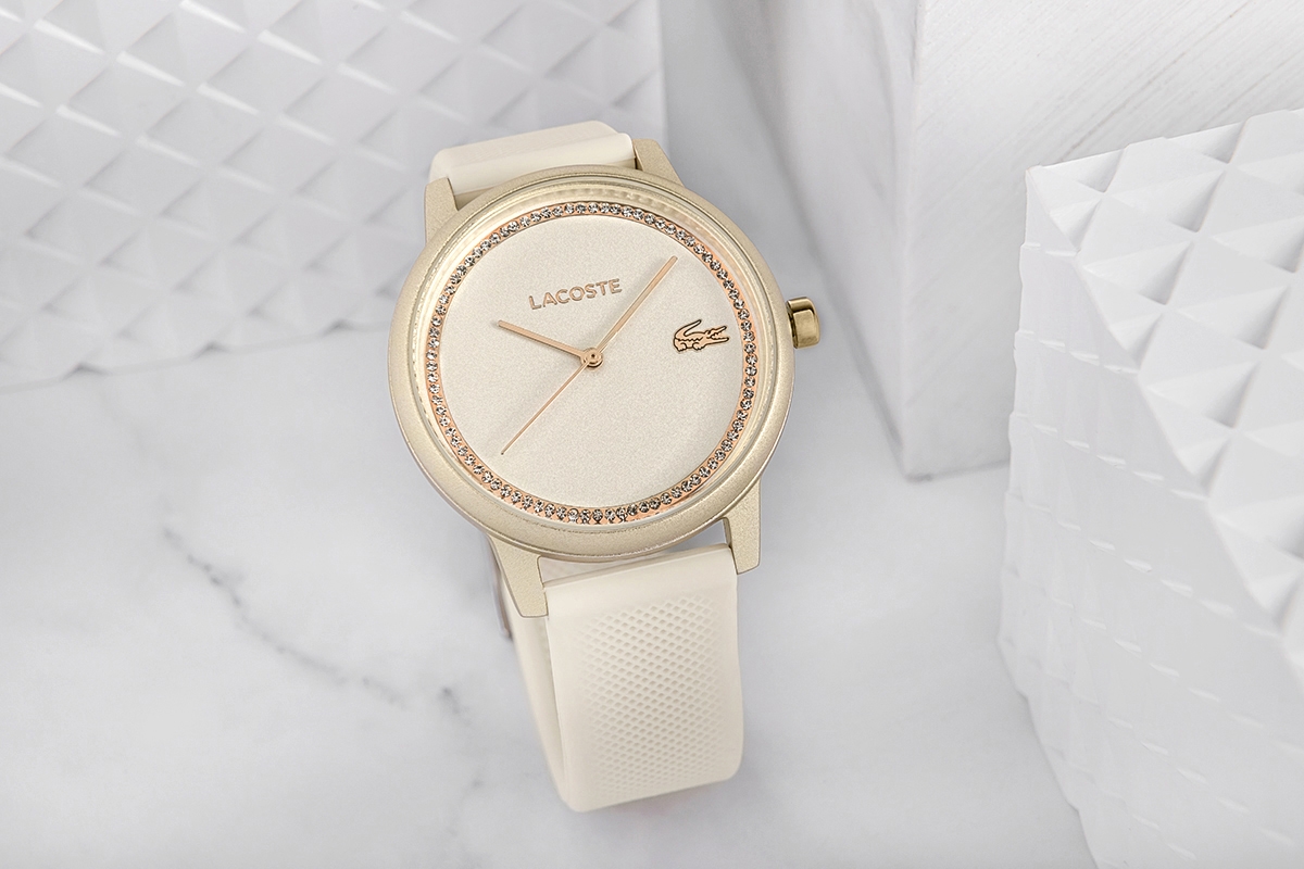 Złocona tarcza, lśniąca niczym ciepłe promienie zachodzącego słońca, dodaje zegarkowi blasku, który nie jest nachalny, ale doskonale wyważony – tak jak perfumy, które zostawiają za sobą delikatną woń luksusu. Cyrkonie, które otaczają tarczę, przypominają rozgwieżdżone niebo – ich subtelne migotanie sprawia, że każda sekunda jest pełna blasku, ale nigdy przesadnego. To wyrafinowany dodatek, który podkreśla klasę bez zbędnego przepychu. Pasek w ciepłym odcieniu kości słoniowej, wykonany z gładkiego, matowego materiału, jest jak delikatny aksamit na skórze – komfortowy, a jednocześnie pełen klasy. Idealnie balansuje pomiędzy klasycznym urokiem a nowoczesnym designem, dodając całości miękkości i subtelności, która kontrastuje z wyrazistą, złotą tarczą. Każdy szczegół, od subtelnie połyskującego napisu LACOSTE po złotego krokodyla na godzinie trzeciej, to niczym biżuteria dodana do codziennej stylizacji, która nie tylko zdobi, ale staje się integralną częścią osobistego stylu.