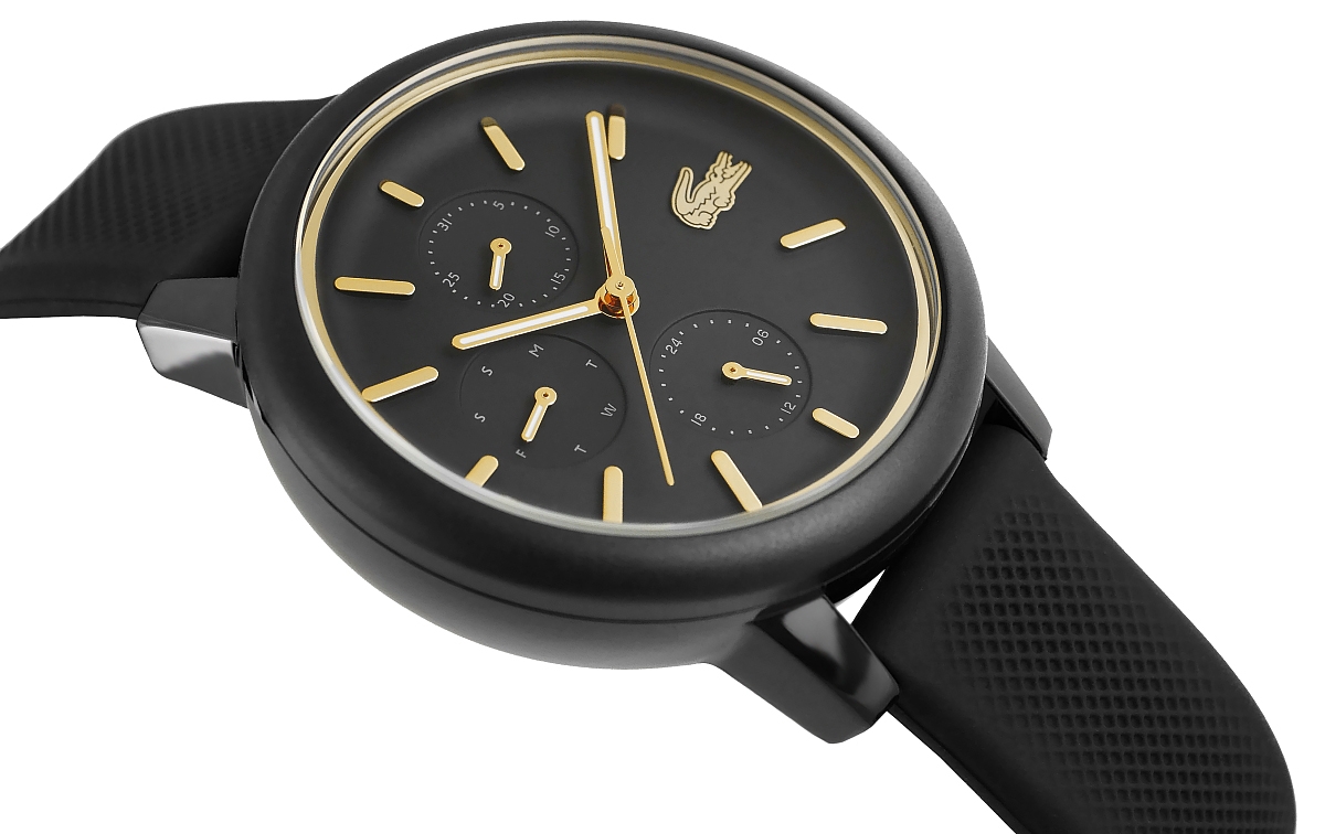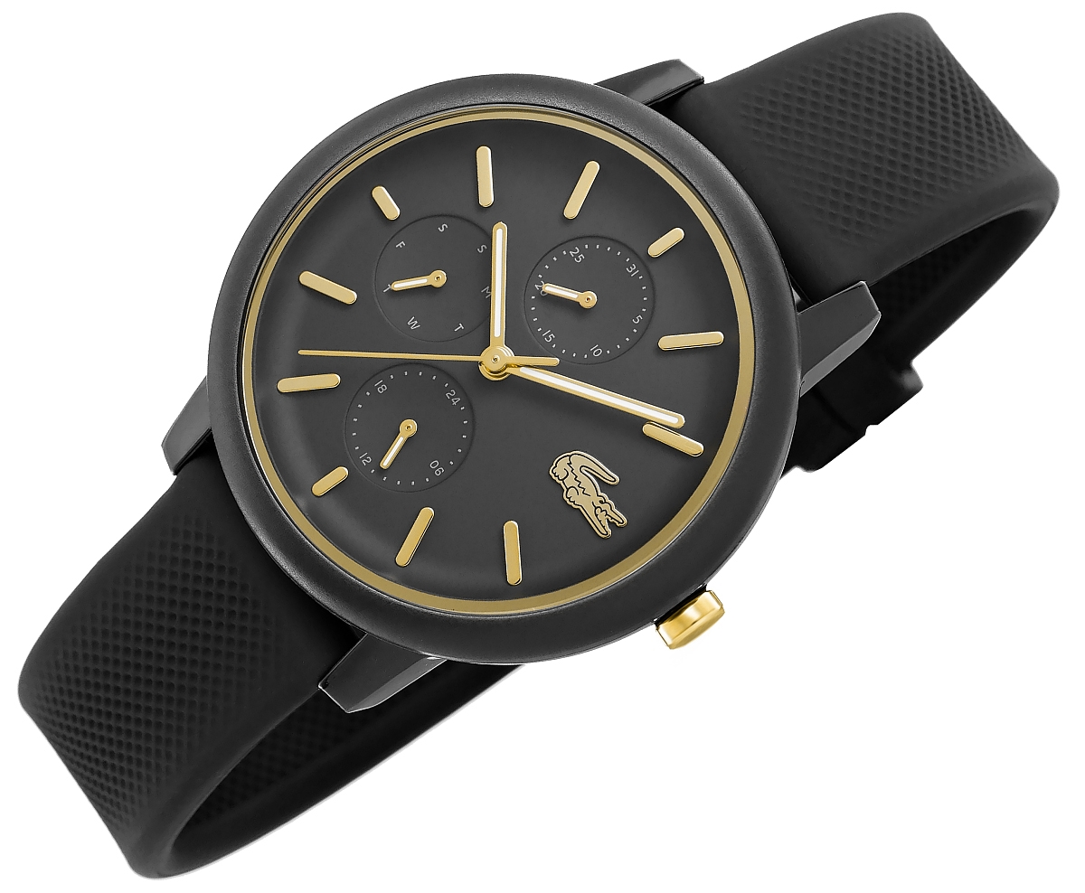 Głęboka, matowa czerń koperty i tarczy tworzy tło pełne tajemnicy, jak letnia noc, która kryje w sobie nieodkryte możliwości. Złote akcenty, niczym subtelny błysk biżuterii, delikatnie rozświetlają projekt, dodając mu luksusowego blasku, ale bez przesadnej ekstrawagancji – tu króluje klasa i wyrafinowanie. Wskazówki w kolorze złota, z delikatnym białym akcentem, przesuwają się po tarczy z gracją, jakby były prowadzone przez cichy taniec czasu, a smukły, złoty sekundnik dodaje całości precyzyjnej nuty, która przyciąga uwagę. Czarny, teksturowany pasek to więcej niż komfort – to stylowy kontrapunkt, który wprowadza nowoczesny, sportowy akcent, doskonale równoważący matową elegancję koperty. Złote detale – logo Lacoste na godzinie 3, korona i sprzączka – to niczym małe, wyrafinowane klejnoty, które dopełniają całość, sprawiając, że noszenie tego zegarka to prawdziwa przyjemność, wyrażająca Twoją kobiecość, siłę i wyczucie stylu.