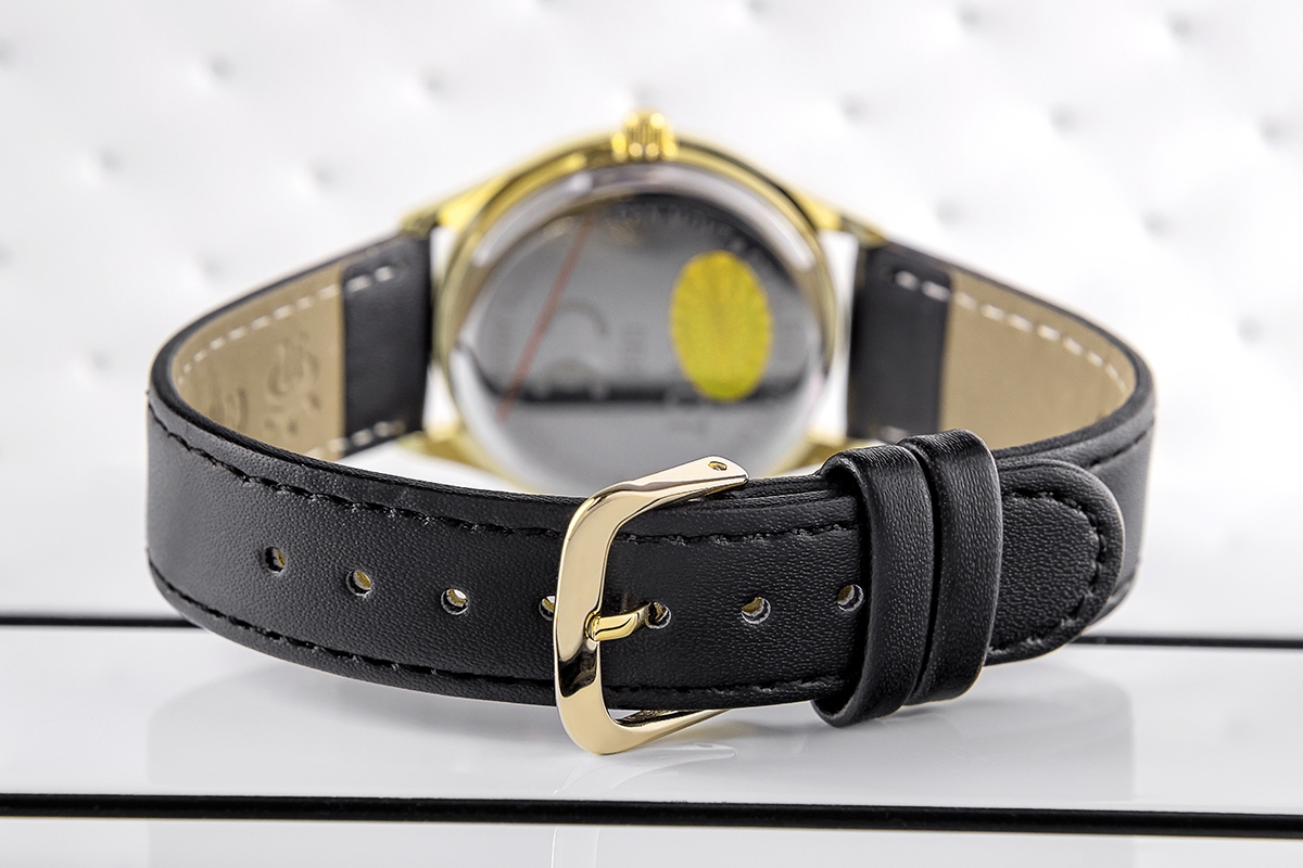 Czarny pasek, starannie wykończony czarną nitką, nadaje zegarkowi nowoczesnego sznytu, sprawiając, że doskonale komponuje się z różnorodnymi stylizacjami. To idealny wybór dla kobiety, która pragnie podkreślić swoją indywidualność i wyrafinowanie, sprawiając, że każda chwila nabiera wyjątkowego blasku.