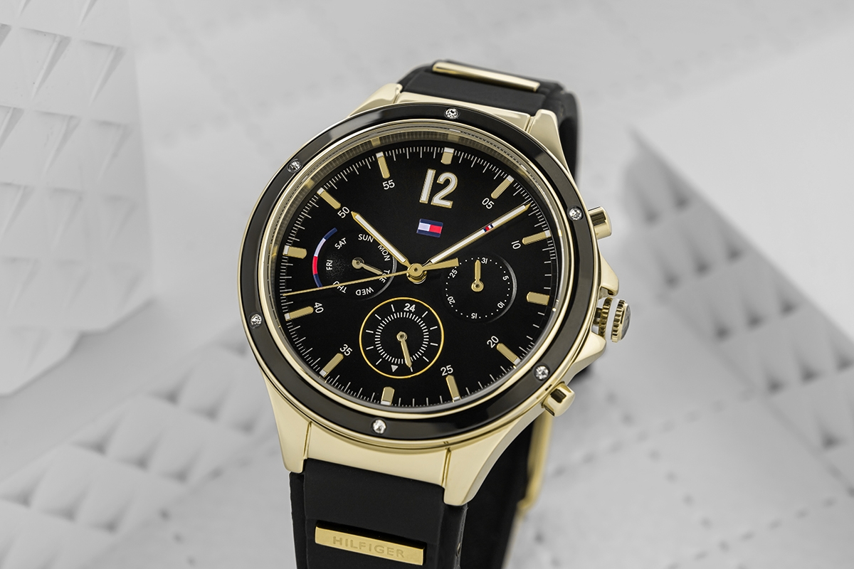 Tommy Hilfiger Eve to zegarek, który oplata nadgarstek zmysłową harmonią złota i czerni, tworząc wyrafinowaną opowieść o kobiecej elegancji.