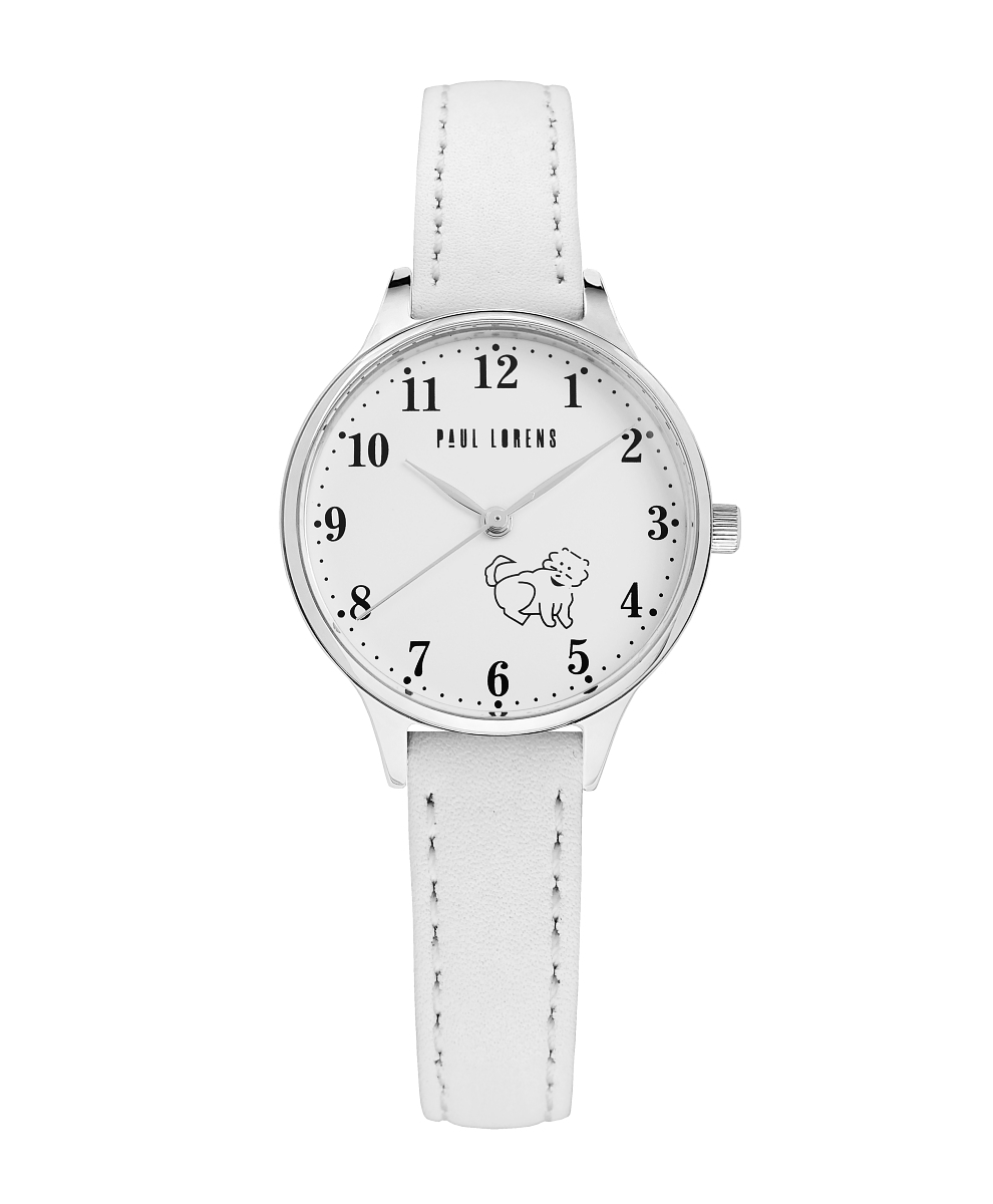 Srebrna koperta harmonijnie współgra z białą tarczą, na której widnieje uroczy wizerunek pieska, dodając zegarkowi radosnego charakteru. Ta subtelna grafika sprawia, że zegarek staje się wyjątkowym, osobistym akcesorium, które maluch będzie nosił z dumą. Srebrne wskazówki i indeksy dodają elegancji, a sprytnie zaprojektowany sekundnik, poruszający się z gracją, uczyni naukę odczytywania czasu przyjemnością i ekscytującą przygodą.