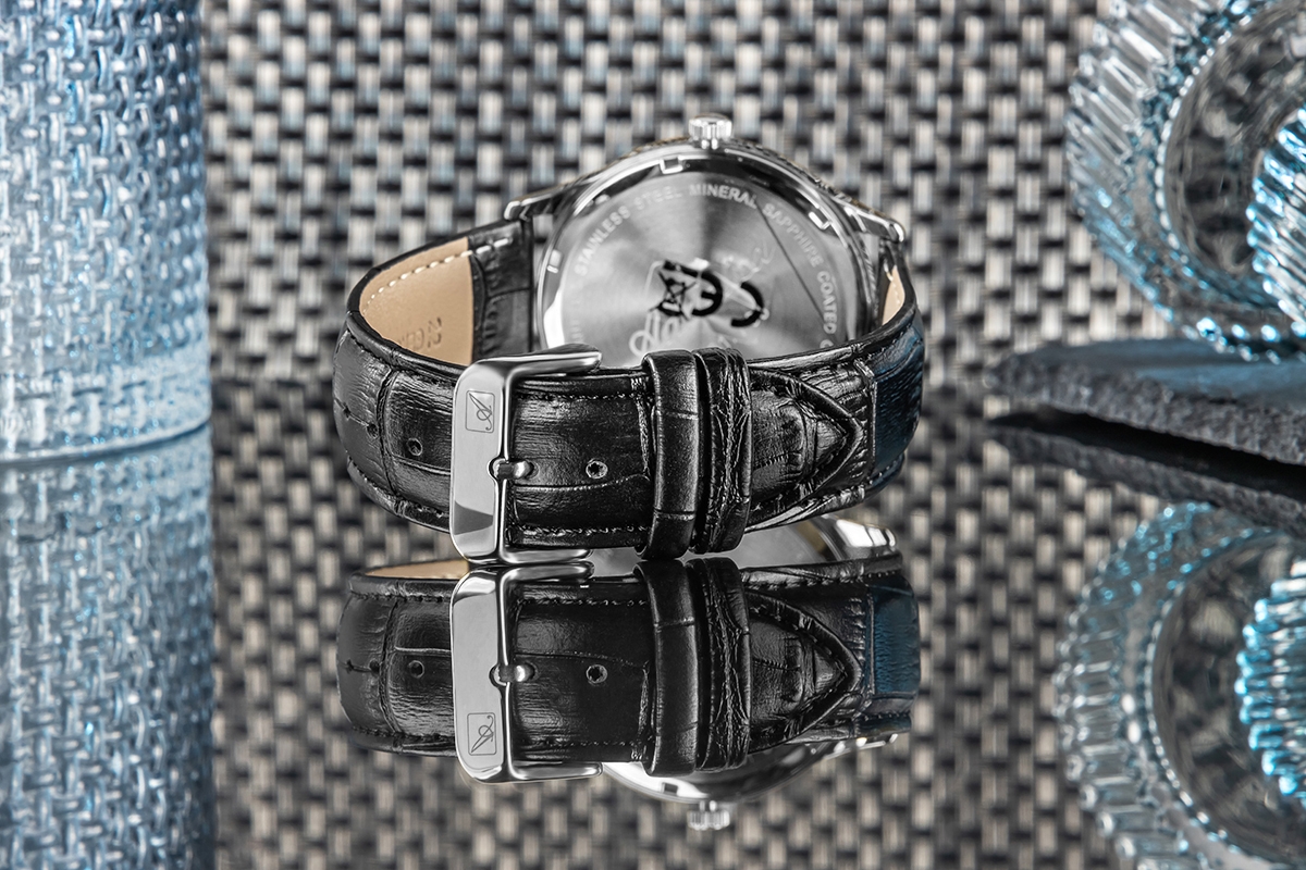 Wzmocnione szkło mineralne z powłoką szafirową to rozsądny wybór dla tych, którzy oczekują wytrzymałości i estetyki bez kompromisów. Powierzchnia utwardzona specjalną warstwą szafiru zapewnia podwyższoną odporność na zarysowania, zachowując przy tym wysoką przejrzystość i komfort codziennego użytkowania. To rozwiązanie łączy zalety klasycznego szkła mineralnego – elastyczność i odporność na uderzenia – z dodatkową ochroną, która czyni zegarek trwalszym i bardziej odpornym na ślady czasu.