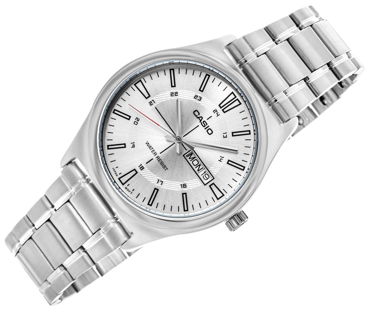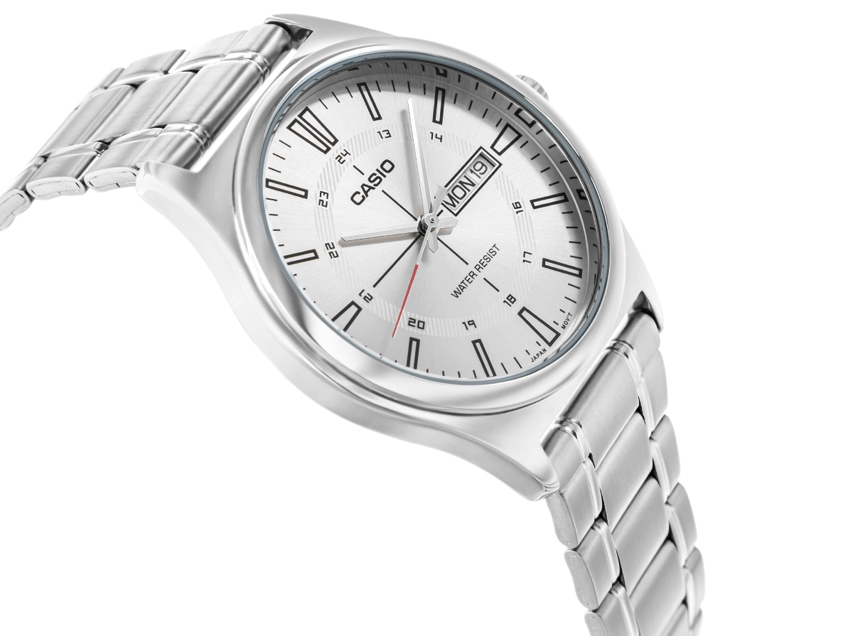 Męski model z kolekcji CASIO wyposażony w klasyczną 38-milimetrową kopertę ze stali nierdzewnej, czytelną tarczę z wyrazistymi indeksami godzinowymi oraz dodatkową skalą 24-godzinną, która ułatwia orientację w czasie. Funkcjonalny datownik umieszczony przy godzinie trzeciej umożliwia szybki podgląd aktualnego dnia tygodnia i dnia miesiąca, a wodoodporność na poziomie WR gwarantuje bezpieczeństwo użytkowania w codziennych sytuacjach. Dzięki bransolecie ze stali szlachetnej o matowym wykończeniu zegarek zyskuje elegancki charakter, który pasuje zarówno do garnituru, jak i do luźniejszego, miejskiego stylu. Mechanizm kwarcowy zapewnia precyzję i niezawodność, z której słynie marka Casio.
