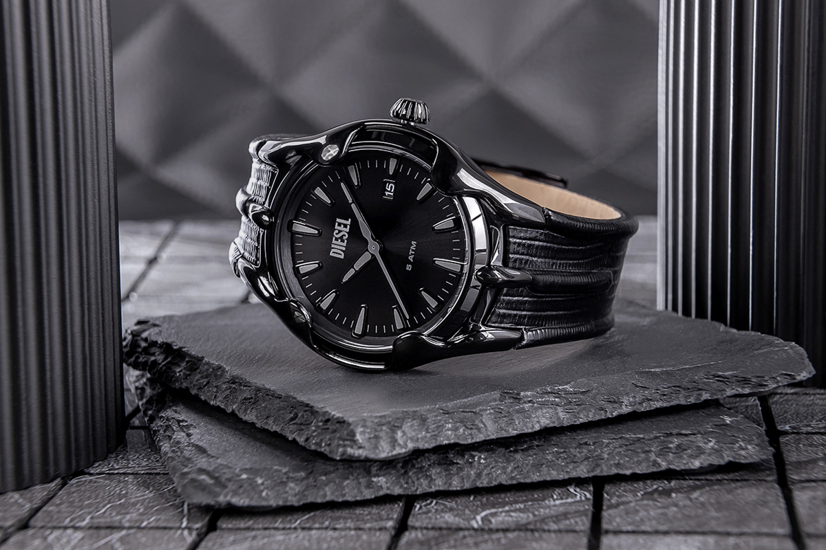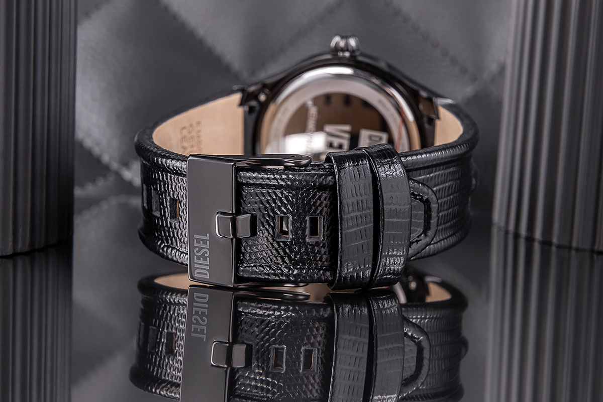 Czarna, matowa tarcza to minimalistyczne tło, które wydaje się pochłaniać światło, tworząc przestrzeń idealną do wyeksponowania detali. Każde spojrzenie na nią przypomina o mocy ciemności, a jednocześnie nie ma tu miejsca na zbędny błysk. Tarcza jest spokojna, skupiona – jak Ty w momencie podejmowania ważnych decyzji. Na tej ciemnej powierzchni wyróżnia się srebrne logo Diesel, jak ukryta siła, gotowa do działania. Ten delikatny błysk przykuwa uwagę i dodaje zegarkowi eleganckiego charakteru. Indeksy oraz wskazówki w odcieniach czerni i szarości wtapiają się w tarczę, tworząc wrażenie jednolitej, głębokiej powierzchni. To nie są barwy, które się wybijają – są tu, aby przypominać, że detale mogą decydować o wygranej. Sekundnik w kolorze szarym, jak cień, delikatnie odmierza czas, bez pośpiechu, ale z nieustępliwością. To minimalistyczny akcent, który wzmacnia poczucie harmonii.