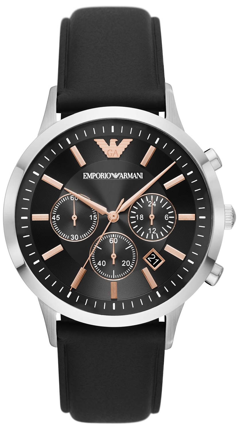 Zegarek męski Emporio Armani Renato AR11431 to elegancki zegarek męski, który łączy klasyczny design z nowoczesnym charakterem. Koperta o średnicy 43 mm wykonana została ze stali szlachetnej w kolorze srebrnym, co gwarantuje trwałość oraz ponadczasowy wygląd. Czarna tarcza z subtelnym połyskiem podkreśla stylowy charakter modelu, a miedziane indeksy i wskazówki zapewniają doskonały styl. Zegarek wyposażono w funkcję chronografu oraz datownik umieszczony pomiędzy godziną 4 a 5, co zwiększa jego funkcjonalność na co dzień. Za precyzyjne działanie odpowiada niezawodny mechanizm kwarcowy, a całość chroni wytrzymałe szkło mineralne. Pasek ze skóry naturalnej o gładkiej strukturze doskonale komponuje się z kopertą, tworząc spójną i elegancką całość, idealną zarówno do garnituru, jak i do codziennego stroju. Model Emporio Armani Renato Chrono AR11431 to propozycja dla mężczyzn ceniących klasykę, jakość i prestiż włoskiego stylu.