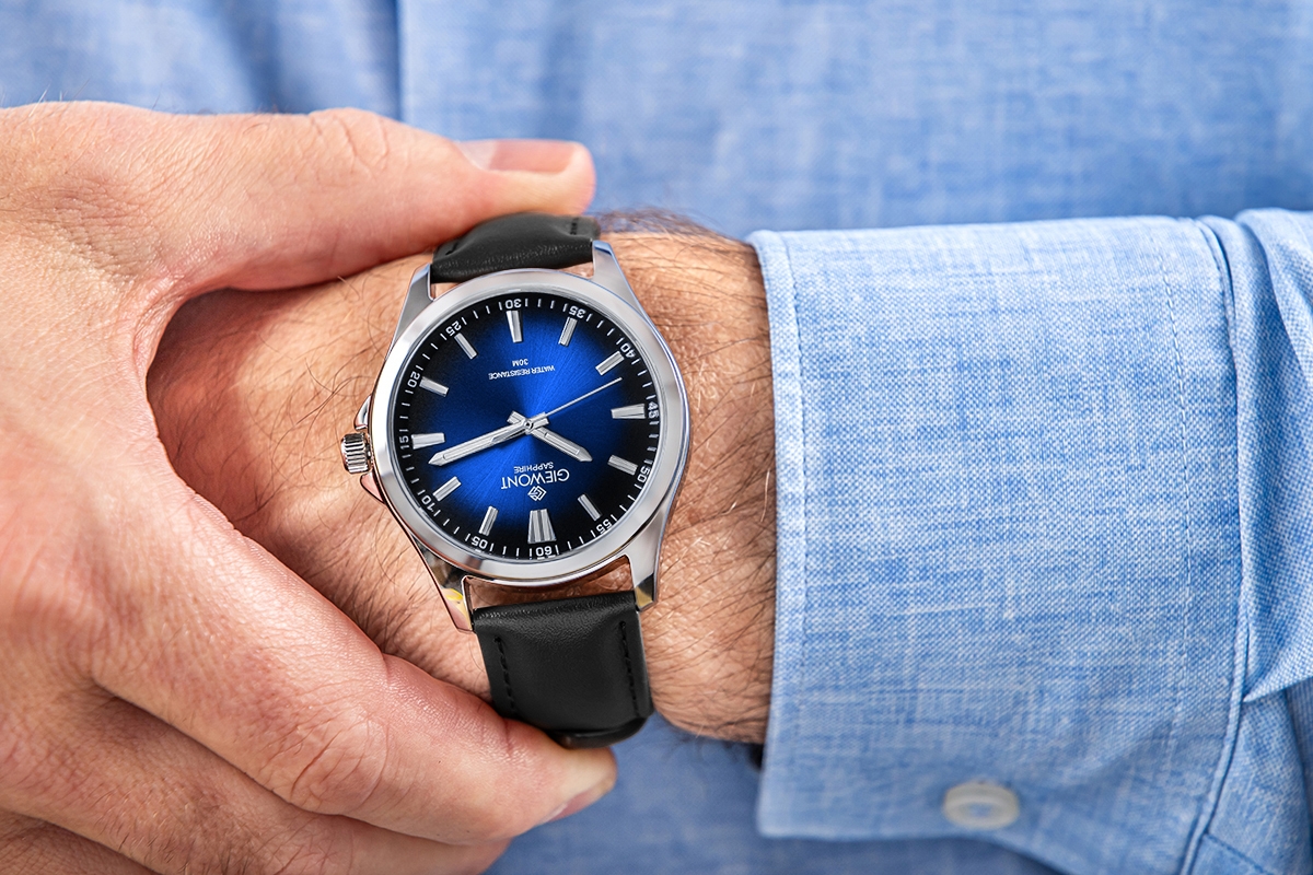 GIEWONT Elegance Sapphire to zegarek stworzony dla mężczyzn, którzy cenią sobie nienaganny styl, dobrą jakość wykonania i detale świadczące o dobrym guście. Jego głęboka, granatowa tarcza o subtelnym, promienistym gradiencie natychmiast przyciąga wzrok i nadaje całości wyjątkowego, prestiżowego charakteru, a odporne na zarysowania szafirowe szkło gwarantuje, że czasomierz zachowa swój nienaganny wygląd przez wiele lat intensywnego użytkowania. Precyzyjne, metaliczne indeksy i smukłe wskazówki zapewniają doskonałą czytelność nawet w trudnych warunkach oświetleniowych, podkreślając jednocześnie elegancki charakter zegarka. Solidna koperta w srebrnym połysku harmonijnie współgra z miękkim, klasycznym skórzanym paskiem, który idealnie dopasowuje się do nadgarstka i sprawia, że noszenie zegarka jest czystą przyjemnością. To uniwersalny, ponadczasowy model, który doskonale sprawdzi się zarówno podczas spotkań biznesowych, formalnych uroczystości, jak i w codziennych stylizacjach, dodając pewności siebie oraz wyrafinowania. GIEWONT Elegance Sapphire to nie tylko stylowy dodatek – to symbol elegancji, dbałości o detale i świadomy wybór mężczyzny, który wie, czego oczekuje od swojego czasu i od swojego stylu.