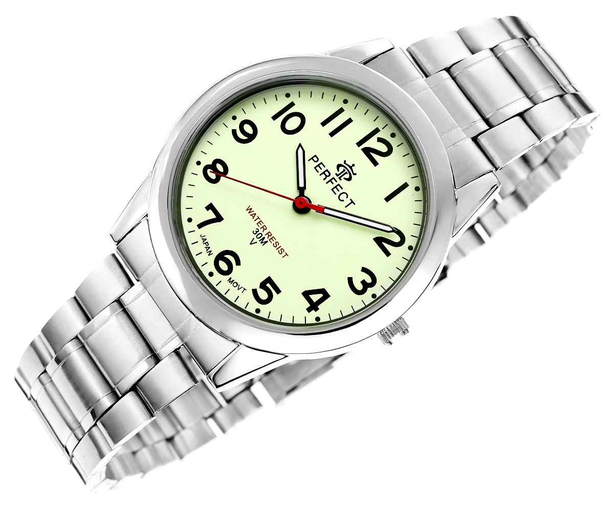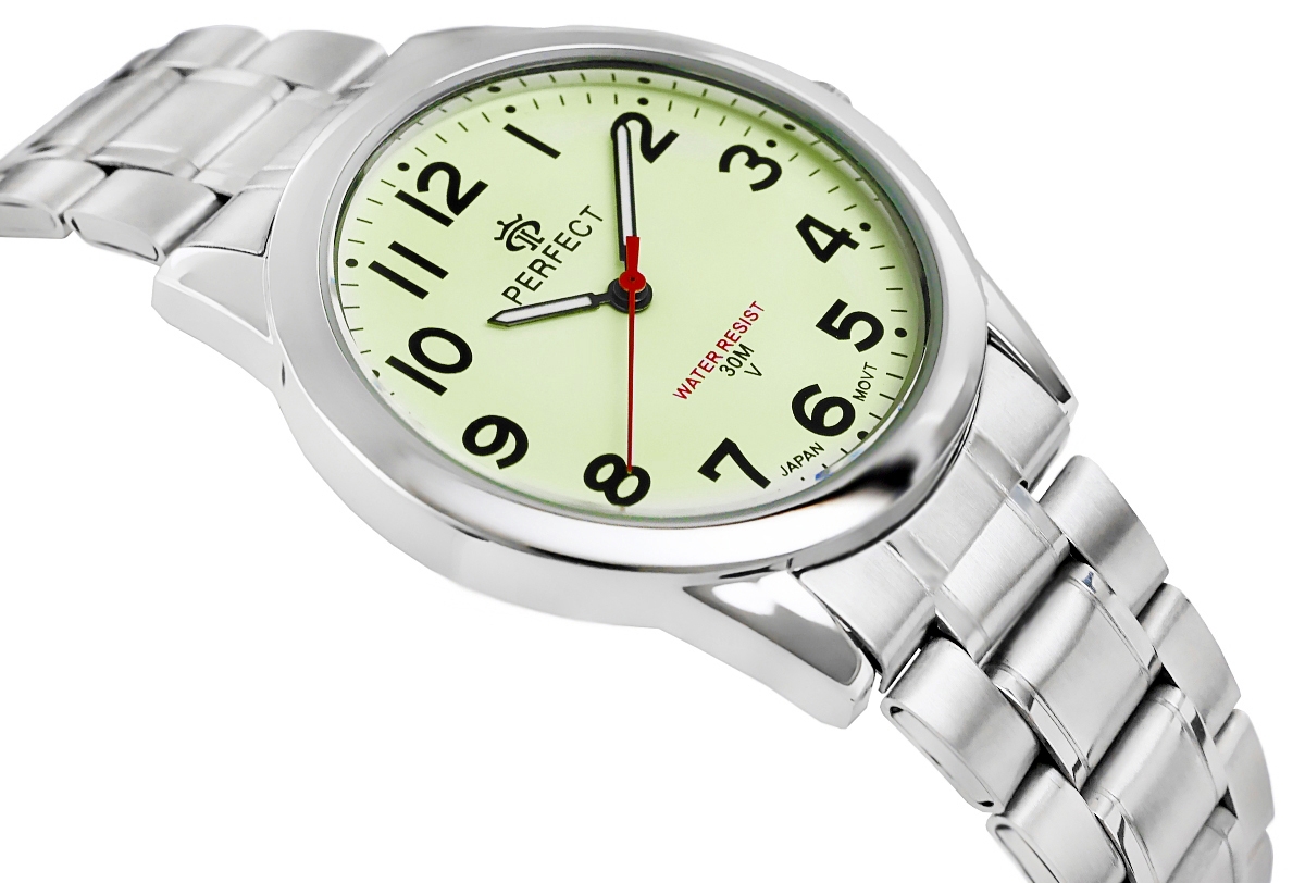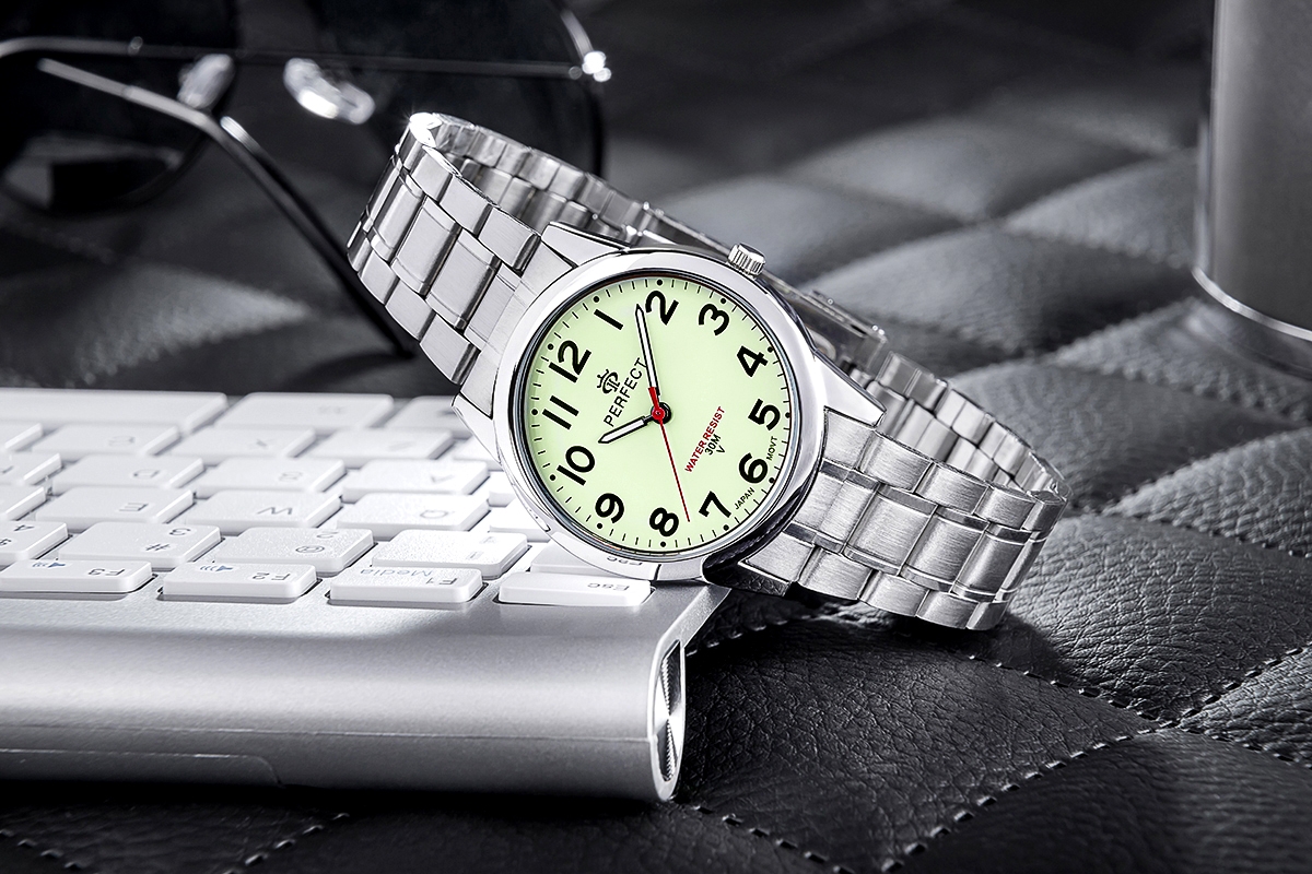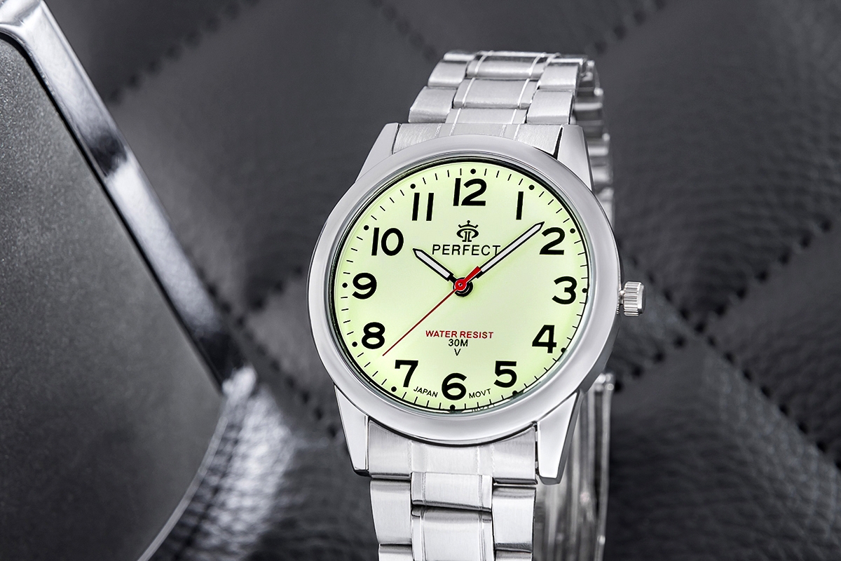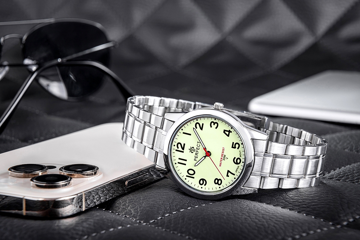 Męski model PERFECT R50 to świetny przykład na to, że funkcjonalność i styl mogą iść w parze. Wytrzymała stalowa bransoleta i klasyczna koperta tworzą spójną całość, która przyciąga uwagę swoim eleganckim, ale i praktycznym wyglądem. Tarcza w jasnozielonym, fluorescencyjnym odcieniu to nie tylko estetyczny akcent – to realne ułatwienie, dzięki któremu odczytasz godzinę nawet w ciemności. Duże cyfry arabskie oraz czerwony sekundnik zapewniają pełną czytelność w każdych warunkach – bez zbędnych ozdobników, czysto i przejrzyście. Zegarek wyposażony jest w niezawodny mechanizm kwarcowy JAPAN MOVT, ceniony za wysoką precyzję działania, a wodoszczelność na poziomie 30M gwarantuje niezawodność w codziennym użytkowaniu. Całość tworzy zegarek, który doskonale sprawdzi się zarówno w pracy, jak i na co dzień – dla mężczyzny, który ceni sobie styl i praktyczność.