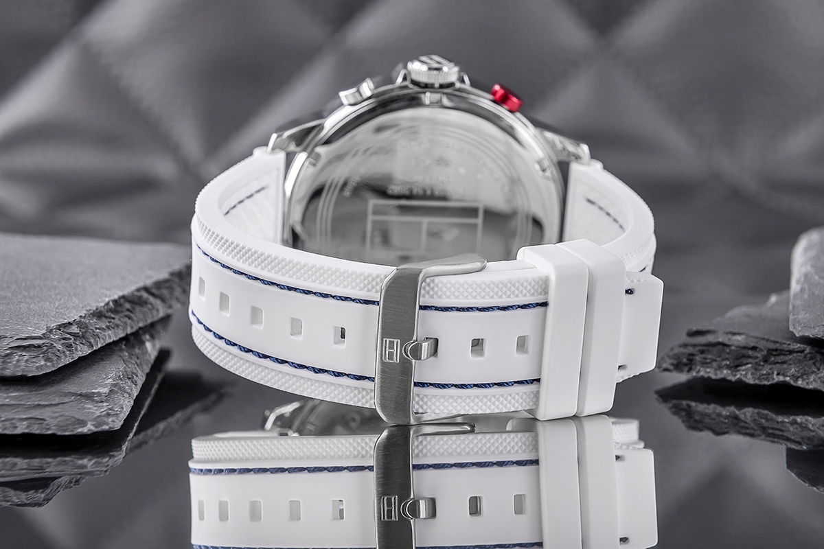 Wyrazisty model, który dumnie prezentuje kolory marki — intensywną czerń, głęboki granat oraz eleganckie akcenty w odcieniach czerwieni i bieli, nawiązując bezpośrednio do klasycznej palety kolorystycznej logo Tommy Hilfiger. Srebrna koperta otacza głęboką, metaliczną tarczę w odcieniu granatu, która przyciąga wzrok swoją intensywnością i grą światła. Białe indeksy na tle granatowej tarczy nadają całości wyrazistości i gwarantują doskonałą czytelność. Granatowo-białe wskazówki dodają subtelnego kontrastu, podkreślając dbałość o detale, a czerwony przycisk chronografu oraz sekundnik w tym samym kolorze wprowadzają odważne akcenty, który ożywiają całą kompozycję. Biały pasek z granatowymi i wytłaczanym napisem HILFIGER przeszyciami to kropka nad „i” — elegancki, a jednocześnie dynamiczny element, który dodaje zegarkowi sportowego charakteru i wyjątkowego stylu.
