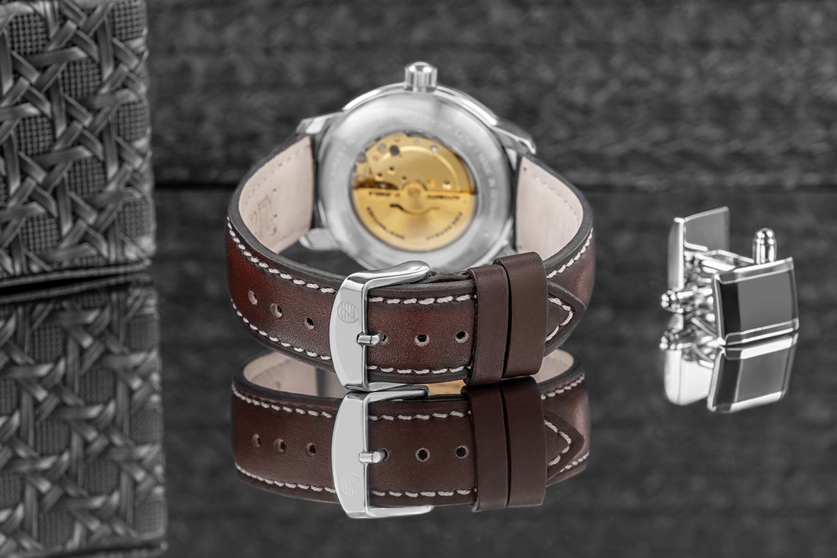 Przezroczysty dekiel, który odsłania precyzyjnie wykonany automatyczny mechanizm, to subtelny detal, który w pełni podkreśla prestiżowy charakter zegarka. Dzięki temu wyjątkowemu rozwiązaniu, możesz podziwiać mistrzowską pracę mechanizmu w każdej chwili, co nadaje zegarkowi jeszcze większego wyrafinowania. Takie rozwiązanie to ukłon w stronę tradycji zegarmistrzowskich, które opierają się na precyzji mechaniki i wysokiej jakości rzemiośle.