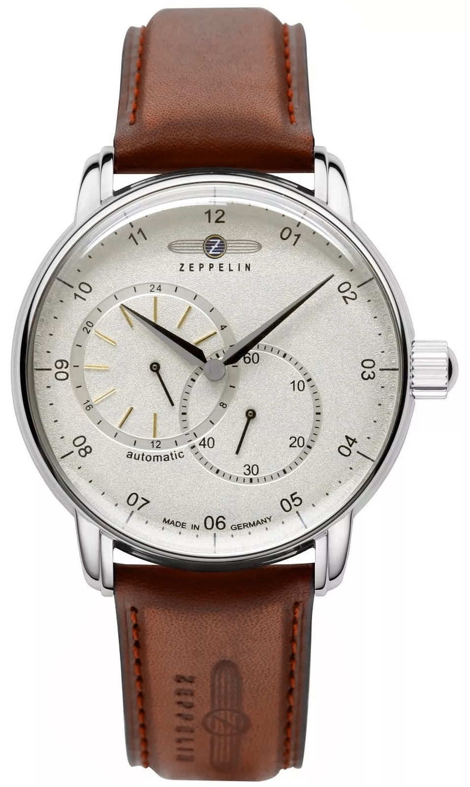 Jego elegancka, srebrna koperta idealnie komponuje się z srebrną tarczą, przyciągając spojrzenia subtelnymi refleksami światła, srebrno złote indeksy i wskazówki czarne z akcentem załamania światłą dodają mu ponadczasowej klasy i zapewniają wyjątkową czytelność. Pasek wykonany z wysokiej jakości skóry w brązowym odcieniu, zszyty brązową nicią, co dodaje mu subtelnego charakteru vintage. Na pasku znajduje się tłoczone logo Zeppelin oraz napis, które podkreślają luksusowy i autentyczny charakter zegarka. Każdy element, od solidnej srebrnej sprzączki po stylową koronkę, został dopracowany, by stworzyć spójną i wyjątkową kompozycję.