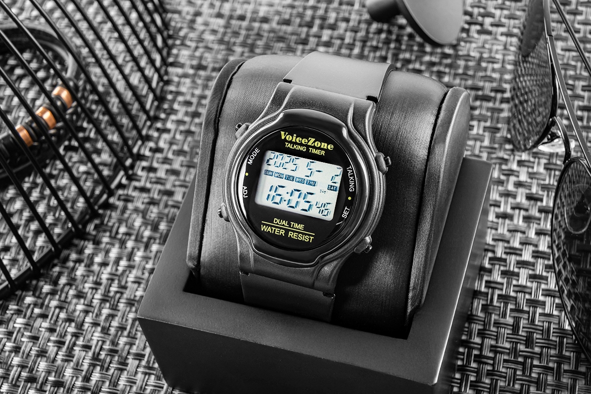 Zegarek informuje głosowo o aktualnym czasie w dwóch strefach czasowych – świetna opcja np. przy kontakcie z rodziną za granicą. Ma również mówiący budzik z funkcją drzemki (dobudzania) oraz głosowy timer – przydatny w kuchni, podczas ćwiczeń lub na spacerze.