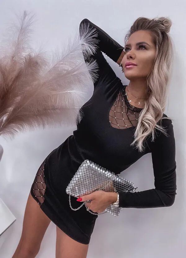 *Шаблон: sukienka ozdobiona siateczką oraz koralikami, w kolorze czarnym, rękaw długi, krój mini.