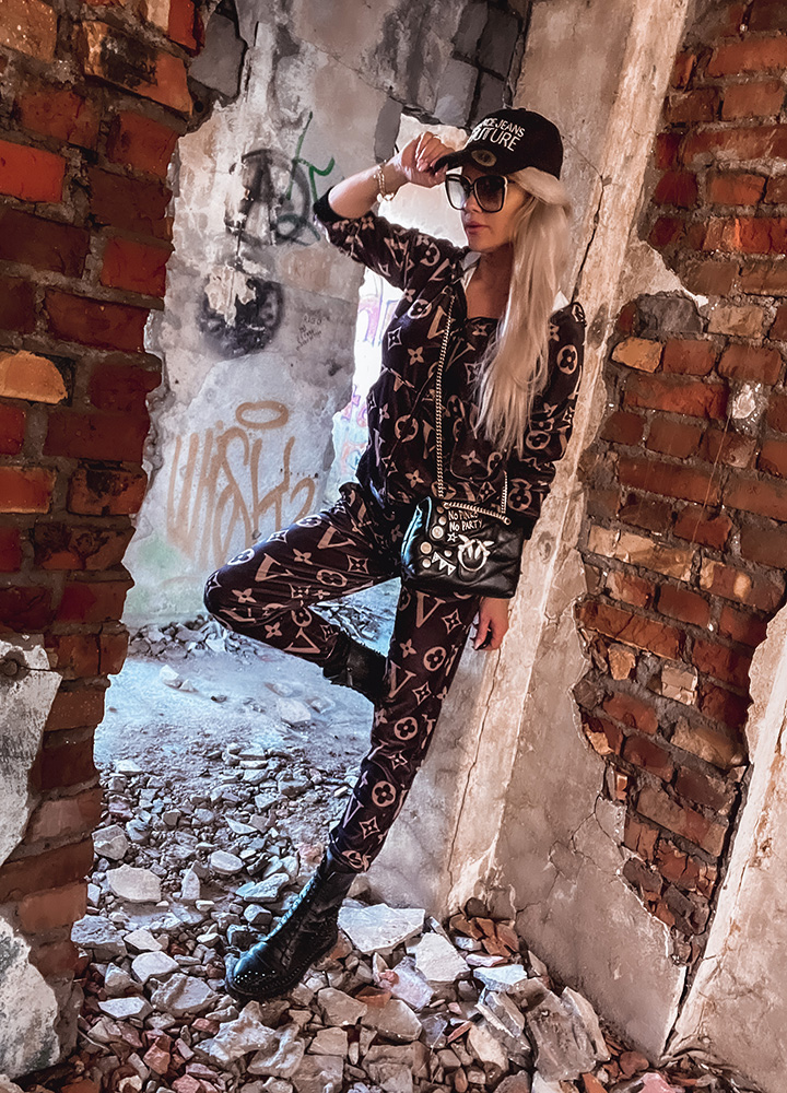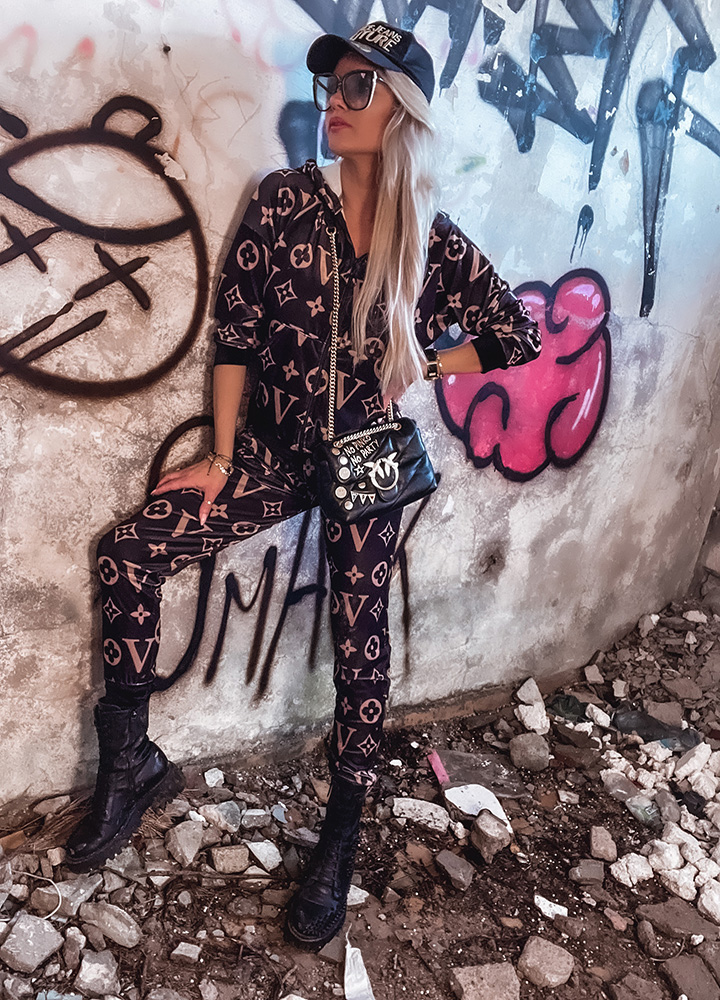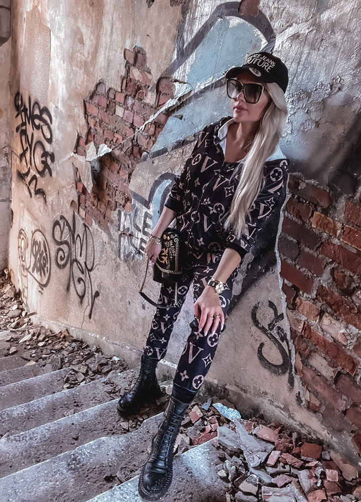 *Деталі: Welurowy komplet dresowy we wzór loui. Kolory czerni oraz beżu.