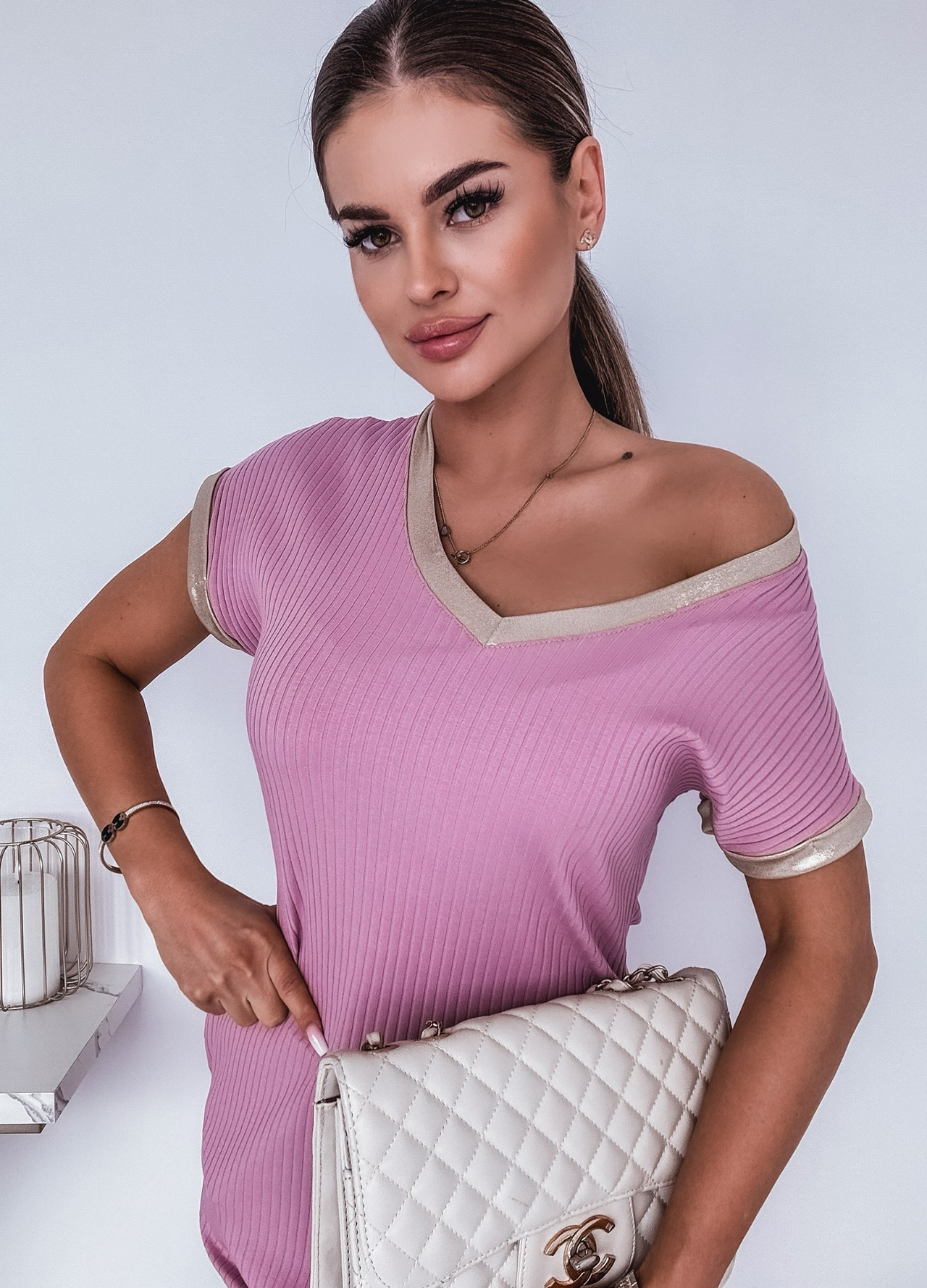 *Шаблон: Prążkowana sukienka ze złotym lampasem przy dekolcie.