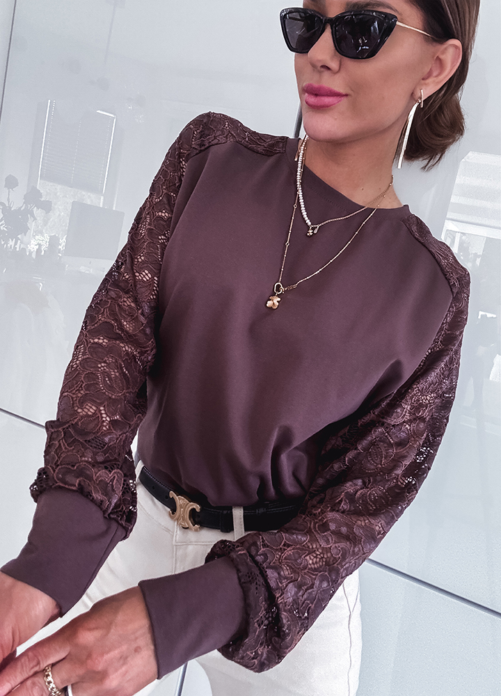CZEKOLADOWA BLUZKA RĘKAW KORONKOWY