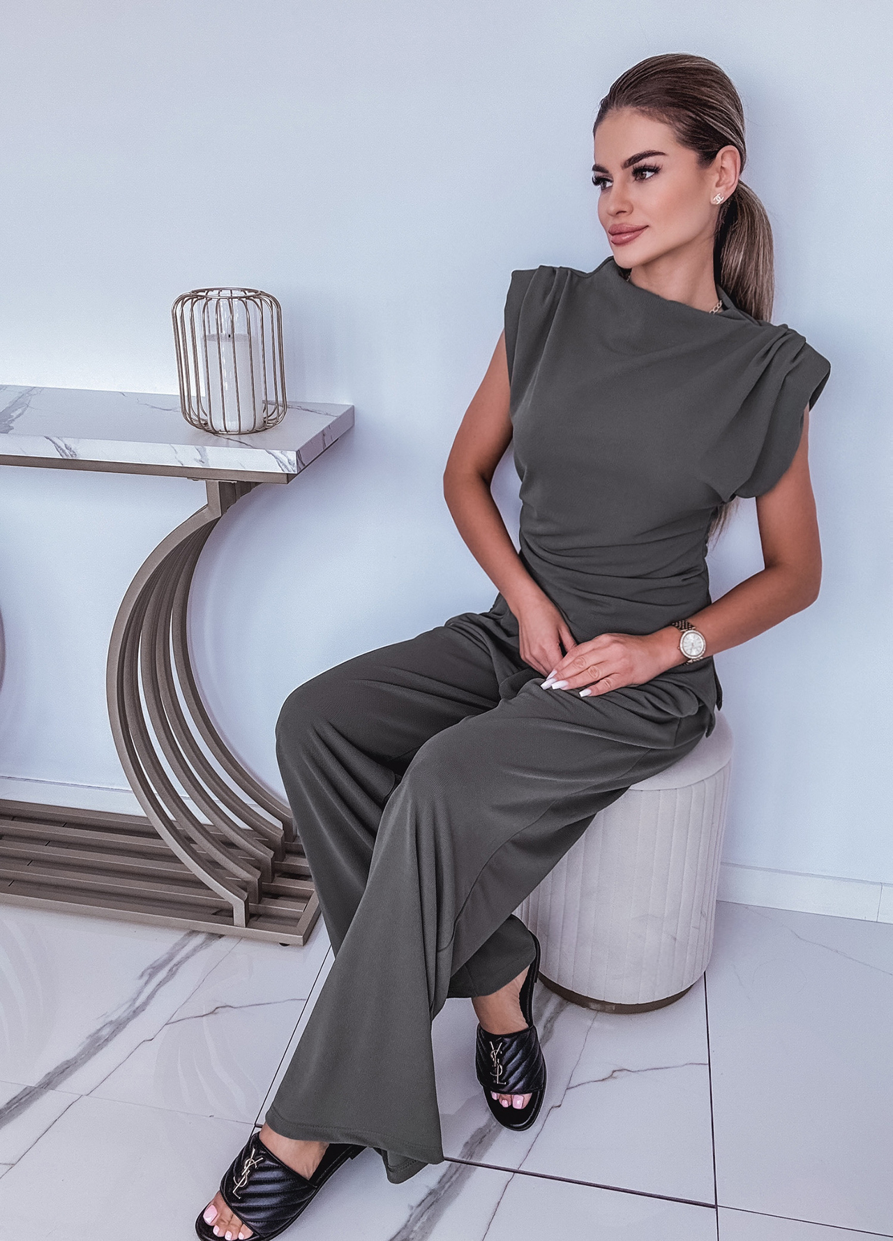 *Деталі: Komplet bluzka z drapowaniem + spodnie z szeroką nogawką w kolorze khaki.