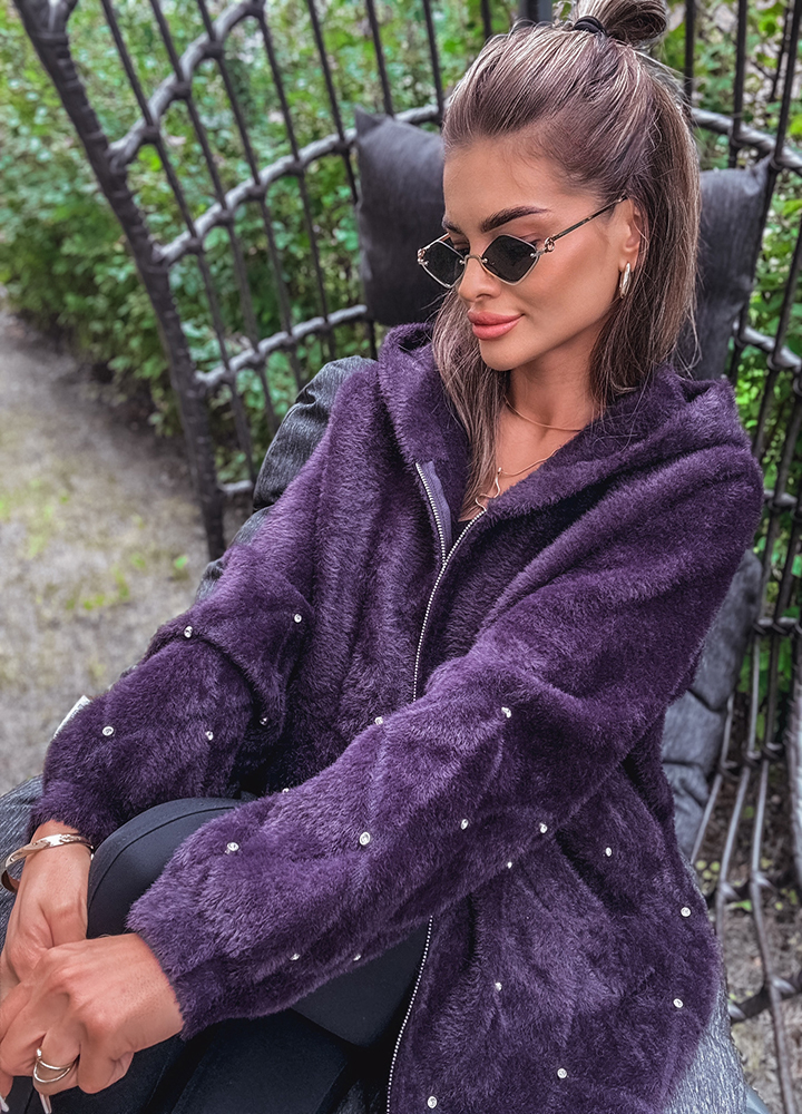 *Шаблон: Alpaka fioletowa z kapturem , kurtka zapinana na zamek zdobiona cyrkoniami , uszyta z miękkiego materiału z dodatkiem wełny i angory, rozmiar one size