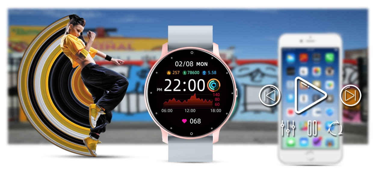 Każdy lubi słuchać swoją ulubioną muzykę. Dzięki bezprzewodowemu połączeniu poprzez bluetooth, od teraz możesz sterować odtwarzaczem muzycznym twojego telefonu komórkowego z poziomu smartwatcha. W ten sposób możesz uprawiać sport w rytm ulubionej muzyki lub relaksować się bez konieczności wyciągania smartfona.