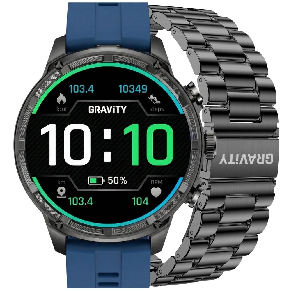 Gravity GT41-2 smartwatch męski został stworzony dla osób, które cenią funkcjonalność, wygodę i nowoczesny wygląd. W zestawie znajduje się niebieski pasek silikonowy oraz dodatkowa stalowa bransoleta, dzięki czemu możesz łatwo dopasować zegarek do okazji. Na niebieskim pasku silikonowym model zyskuje bardziej sportowy i praktyczny charakter, idealny na co dzień, spacer, trening czy wyjazd. Po założeniu stalowej bransolety prezentuje się bardziej elegancko, nowocześnie i solidnie.