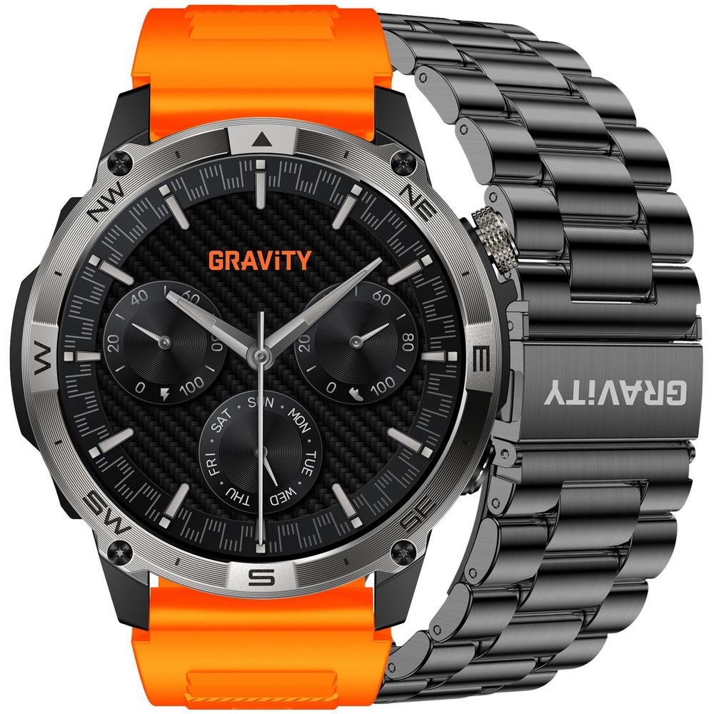 Gravity GT46-4 smartwatch męski został stworzony dla osób, które cenią funkcjonalność, wygodę i nowoczesny wygląd. W zestawie znajduje się pomarańczowy pasek silikonowy oraz dodatkowa czarna stalowa bransoleta, dzięki czemu możesz łatwo dopasować zegarek do okazji. Na silikonowym pasku model zyskuje bardziej sportowy i praktyczny charakter, idealny na co dzień, spacer, trening czy wyjazd. Po założeniu stalowej bransolety prezentuje się bardziej elegancko, nowocześnie i solidnie.