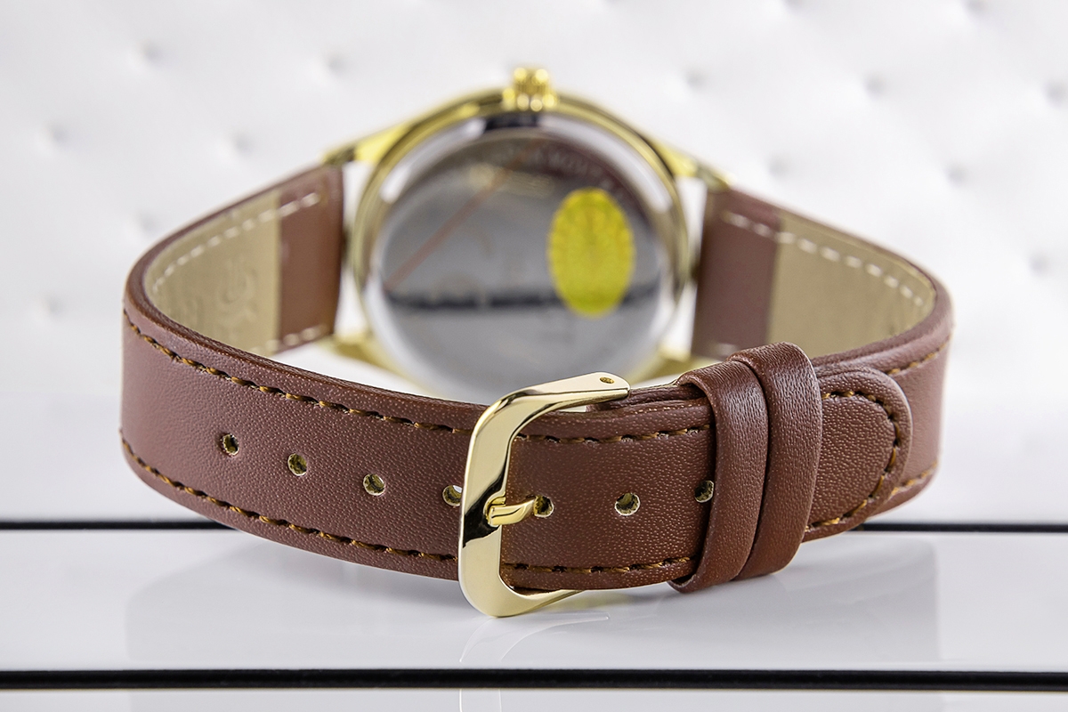 Brązowy pasek, starannie wykończony brązową nitką, wprowadza nutę przytulności i stylu, doskonale harmonizując z resztą zegarka. To idealny wybór dla kobiety, która pragnie podkreślić swoją indywidualność i wyrafinowanie w codziennych stylizacjach. Z tym zegarkiem każda chwila nabiera wyjątkowego blasku.