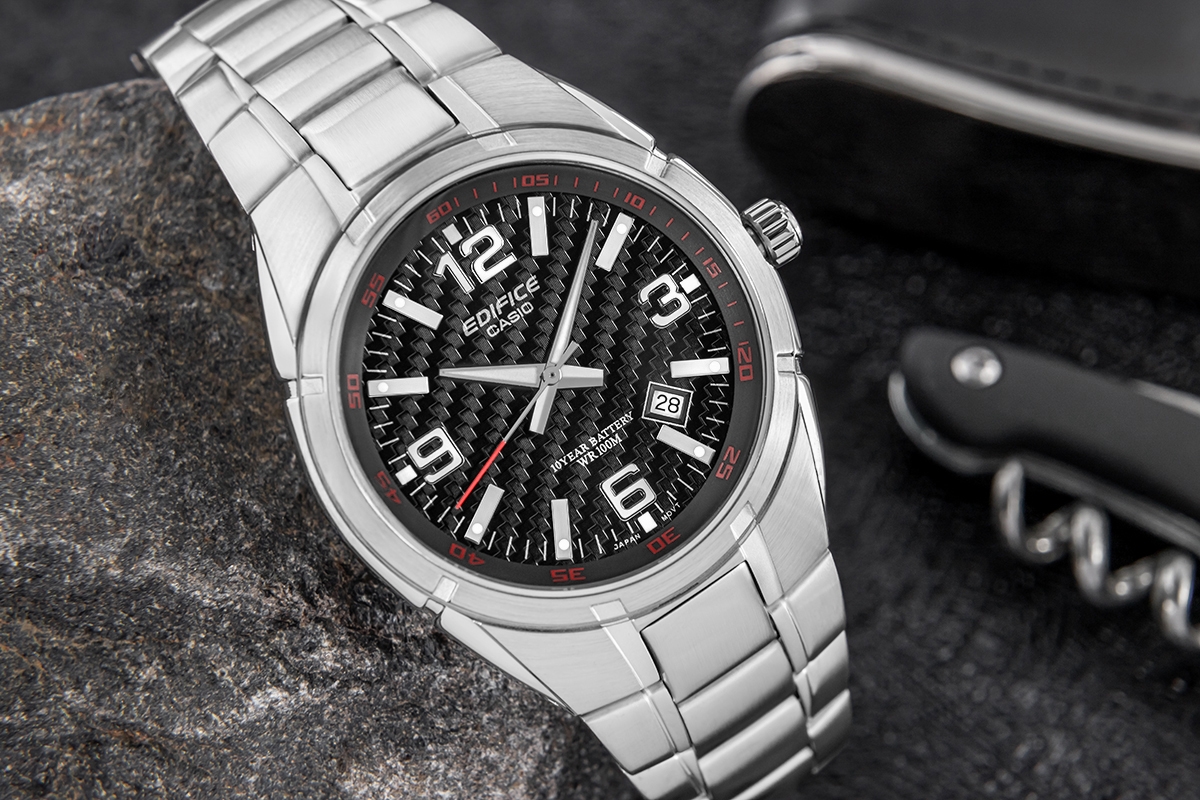 CASIO EDIFICE EF-125D-1AVEG który łączy precyzję kwarcowego mechanizmu z solidnym, stalowym wykonaniem. Czarna karbonowa tarcza dodaje sportowego charakteru, a czerwone cyfry na zewnętrznej krawędzi tarczy w zegarku pełnią funkcję podziałki minutowej lub sekundowej, ułatwiając szybkie odczytywanie czasu. Wodoszczelność 10 BAR pozwala na swobodę w wodzie, a fluorescencyjne podświetlenie gwarantuje widoczność nawet po zmroku. Wybierając ten model CASIO EDIFICE zyskujesz topowy zegarek męski, który spełnia najwyższe oczekiwania.