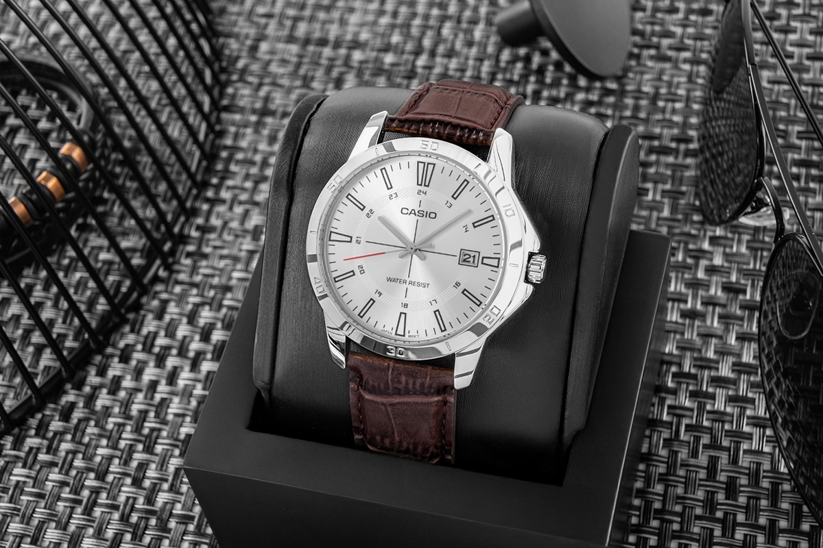 Klasyczny zegarek analogowy CASIO zaprojektowany w oparciu o ponadczasowy wygląd wskazówek godzinowej, minutowej i sekundowej — idealny zarówno na co dzień, jak i na bardziej formalne okazje. Srebrna tarcza z subtelnym, koncentrycznym wzorem zawiera pierścień z 24-godzinnym formatem czasu, a czerwona wskazówka sekundowa dodaje całości dynamicznego, sportowego akcentu. Smukłe indeksy liniowe oraz praktyczny datownik z dniem tygodnia na godzinie 3 łączą stylowy wygląd z funkcjonalną wygodą. Wodoodporność na potrzeby codziennego użytkowania pozwala czuć się swobodnie podczas mycia rąk czy w deszczową pogodę. Prosty, elegancki akcent, który dopełnia każdy styl.