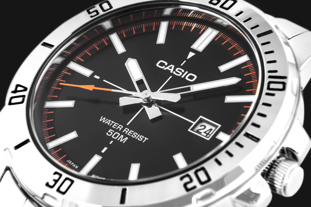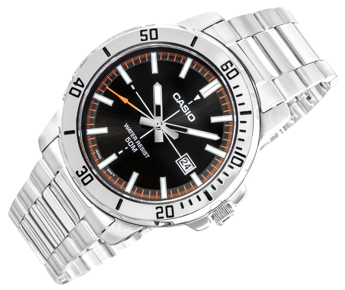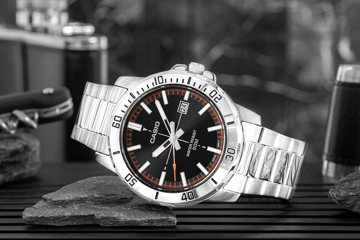 Klasyczny model CASIO, który wyróżnia się solidną, 44-milimetrową kopertą ze stali nierdzewnej oraz czarną tarczą z dynamicznymi, pomarańczowymi akcentami, które nadają mu energiczny, męski charakter. Wyraźne indeksy i masywne wskazówki zapewniają doskonałą czytelność w każdej sytuacji – od porannego biegu po późne spotkanie biznesowe. Praktyczny datownik przy godzinie trzeciej oraz wodoodporność 50M czynią ten zegarek idealnym wyborem na każdy dzień – niezależnie od pogody i trybu życia. Dzięki stalowej bransolecie z klasycznym zapięciem potrójnym, model ten łączy elegancję z codzienną funkcjonalnością. Napędzany precyzyjnym mechanizmem kwarcowym, sprawdzi się u mężczyzny, który ceni sobie praktyczność, trwałość i nowoczesny wygląd.