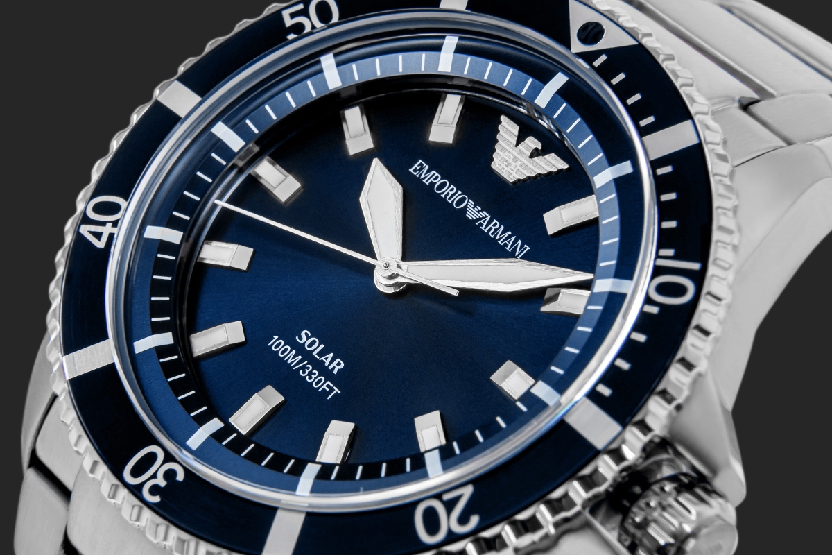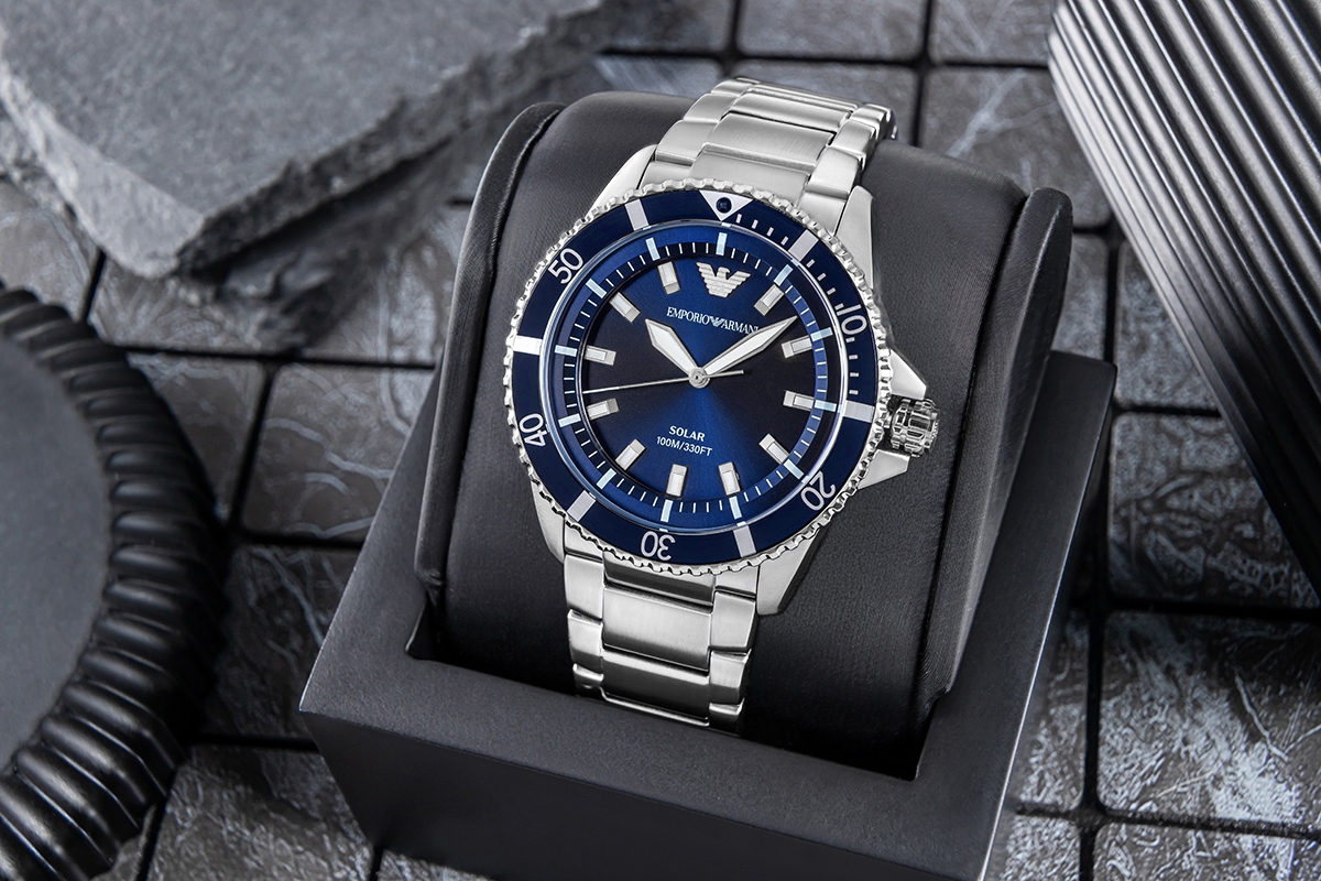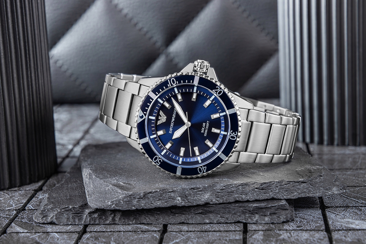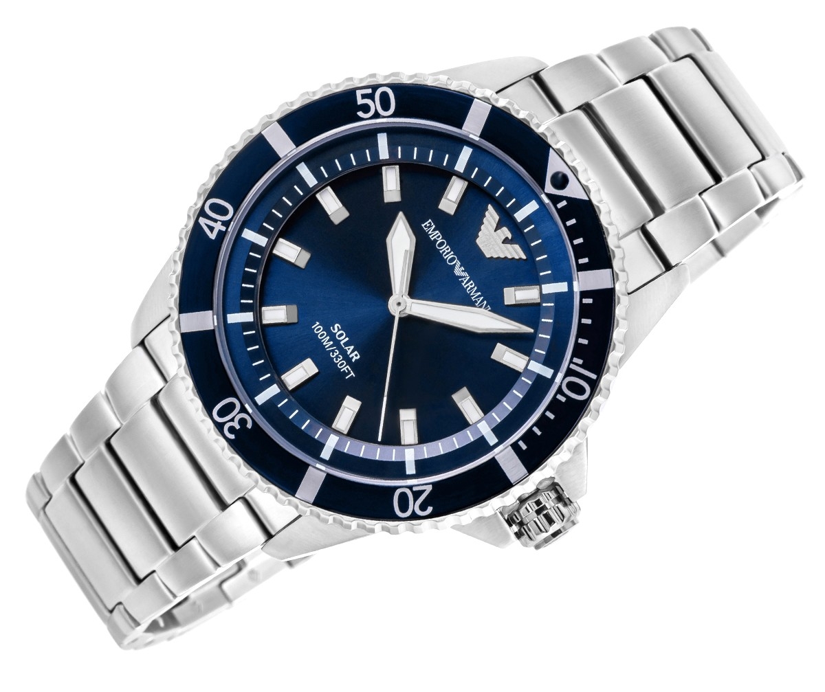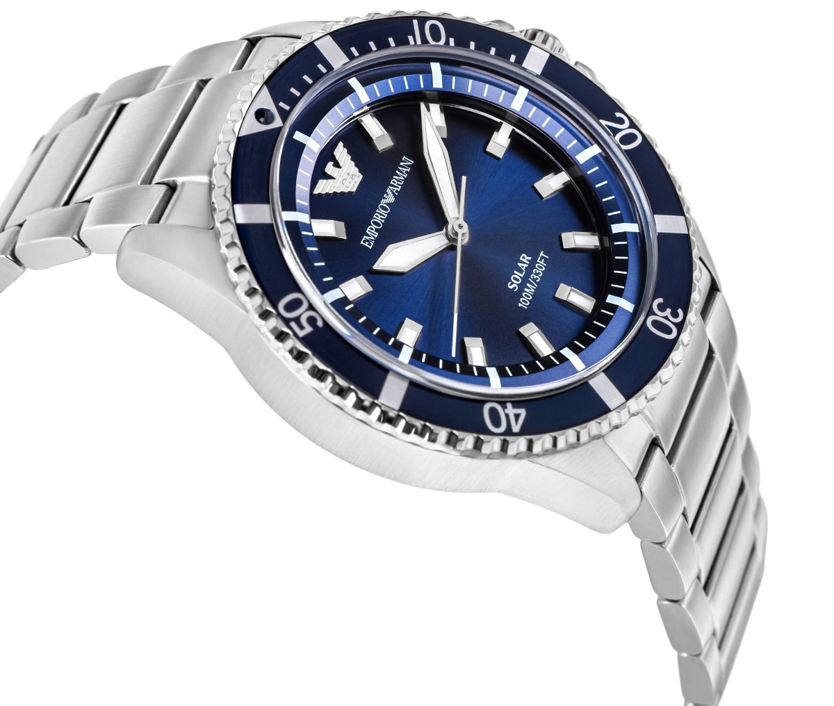 Zegarek Emporio Armani World Explorer AR11697 to model stworzony dla mężczyzn, którzy cenią wyrazisty styl, nowoczesne rozwiązania i dopracowane detale inspirowane sportową elegancją. Już na pierwszy rzut oka przyciąga uwagę efektownym połączeniem granatowej tarczy, srebrnej stalowej bransolety oraz wyrazistej, nurkowej lunety w tym samym kolorystycznym tonie. Całość tworzy bardzo spójną, świeżą i zdecydowanie męską kompozycję, która świetnie prezentuje się zarówno na co dzień, jak i w bardziej eleganckich stylizacjach. Oficjalne materiały marki wskazują, że jest to model z linii World Explorer z solarnym mechanizmem i stalową bransoletą, utrzymany w sportowo-miejskim charakterze.