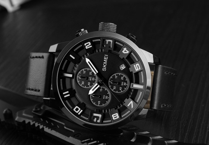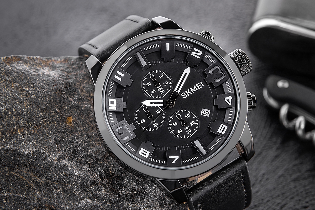 Zegarek Skmei 1309BK to elegancki i wyrazisty model o ciemnej, monochromatycznej kolorystyce, wyposażony w funkcje datownika oraz stopera. Wskazówki na tarczy głównej wskazują godziny, minuty i sekundy, a dodatkowe subtarcze pełnią funkcje chronografu, umożliwiając precyzyjny pomiar czasu. Model łączy w sobie elegancję i funkcjonalność, stając się idealnym towarzyszem zarówno w codziennych wyzwaniach, jak i podczas wyjątkowych momentów.