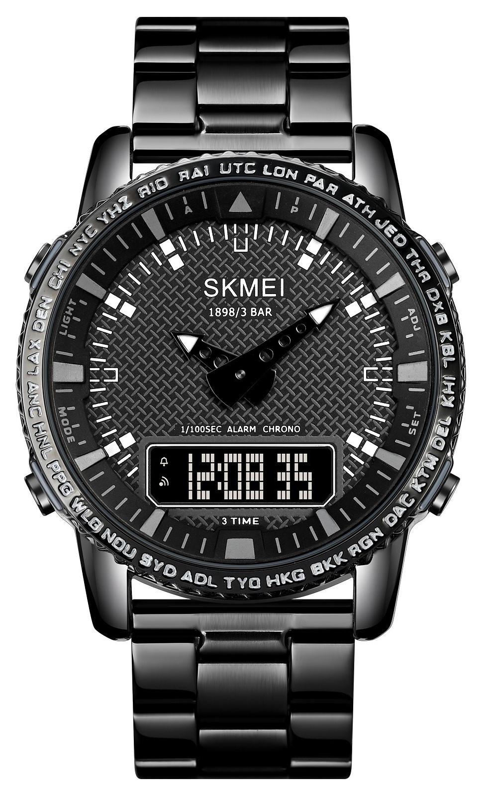 Zegarek Skmei to prawdziwe narzędzie do zarządzania męskim czasem – funkcjonalny i niezawodny, zaprojektowany z myślą o mężczyźnie, który potrzebuje czegoś więcej niż tylko wskazania godziny. Teksturowana tarcza nadaje mu głębi i surowego, męskiego charakteru, wyróżniając go spośród typowych, gładkich modeli.Obramowanie z wygrawerowanymi skrótami miast i stref czasowych, takich jak NYC, LON, czy SYD, podkreśla jego globalny styl i przydatność dla mężczyzny, który żyje i działa na poziomie międzynarodowym.