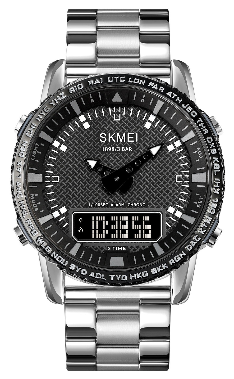 Zegarek Skmei to prawdziwe narzędzie do zarządzania męskim czasem – funkcjonalny i niezawodny, zaprojektowany z myślą o mężczyźnie, który potrzebuje czegoś więcej niż tylko wskazania godziny. Teksturowana tarcza nadaje mu głębi i surowego, męskiego charakteru, wyróżniając go spośród typowych, gładkich modeli.Obramowanie z wygrawerowanymi skrótami miast i stref czasowych, takich jak NYC, LON, czy SYD, podkreśla jego globalny styl i przydatność dla mężczyzny, który żyje i działa na poziomie międzynarodowym.